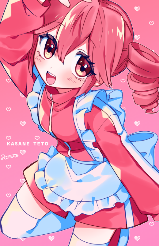 1girl apron arm_up blush character_name commentary_request drill_hair frilled_apron frills heart jacket jersey_maid kasane_teto long_sleeves looking_at_viewer maid open_mouth pink_background pink_eyes pink_hair shorts smile solo standing standing_on_one_leg thighhighs track_jacket twin_drills unconventional_maid utau yuusuke-kun