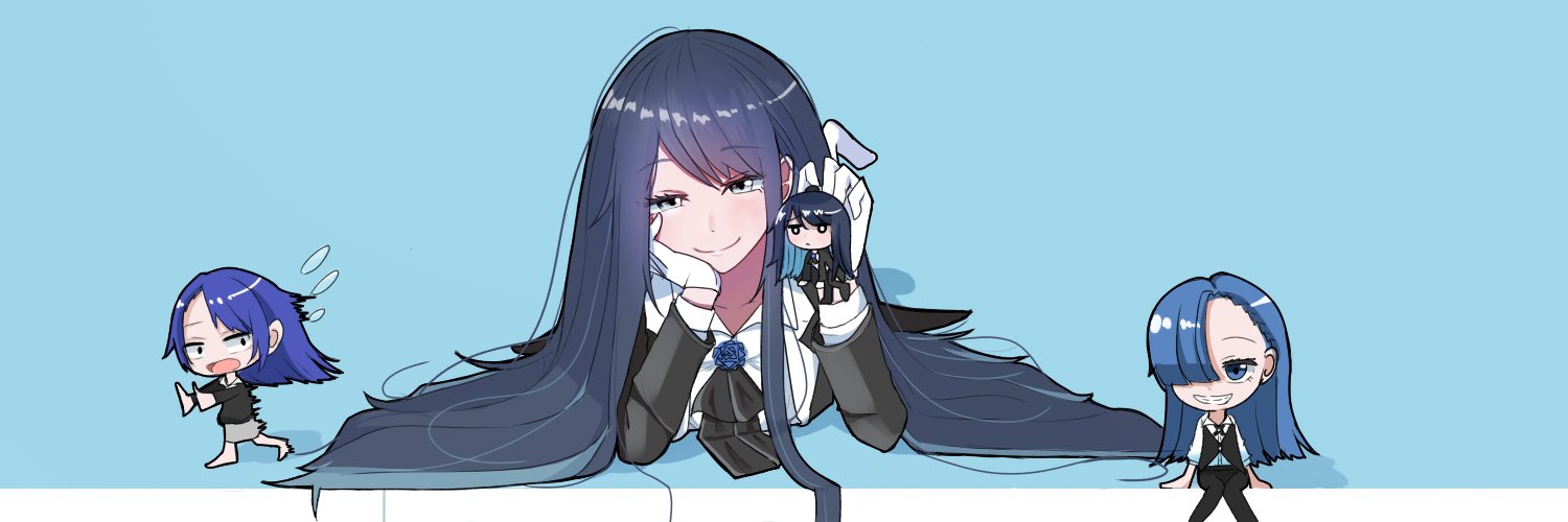 3girls ado_(utaite) atashi_wa_mondaisaku black_eyes black_hair black_pants black_ribbon black_sweater black_vest blue_background blue_eyes blue_flower blue_hair blue_rose brooch chando_(ado) character_doll chibi collared_shirt colored_inner_hair commentary_request doll dress_shirt flower flower_brooch gloves grey_skirt hair_over_one_eye hair_spread_out head_rest jewelry long_hair long_sleeves looking_at_viewer lying merry_(ado) mole mole_under_eye multicolored_hair multiple_girls neck_ribbon on_stomach pants readymade_(ado) ribbon rose shirt sidelocks sitting skirt sweater tanaka_keiko_(ado) tanake_(tanakei_ado) three-quarter_sleeves utaite variant_set vest white_gloves white_shirt