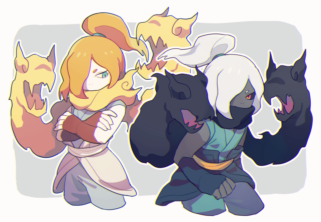 2boys aqua_eyes aqua_pants black_gloves black_scarf black_sclera chromatic_aberration colored_sclera covered_mouth cowboy_shot cropped_legs crossed_arms dual_persona fingerless_gloves gloves grey_background grey_pants hair_over_one_eye high_ponytail hikariorochi kageorochi kimono_collar looking_to_the_side male_focus mino_(mino_cat) multiple_boys nostrils official_alternate_color orange_hair orange_sash outline outside_border pants ponytail red_eyes red_gloves sash scarf sentient_scarf short_eyebrows short_ponytail sideways_glance white_background white_hair white_outline white_sash yellow_scarf youkai_watch