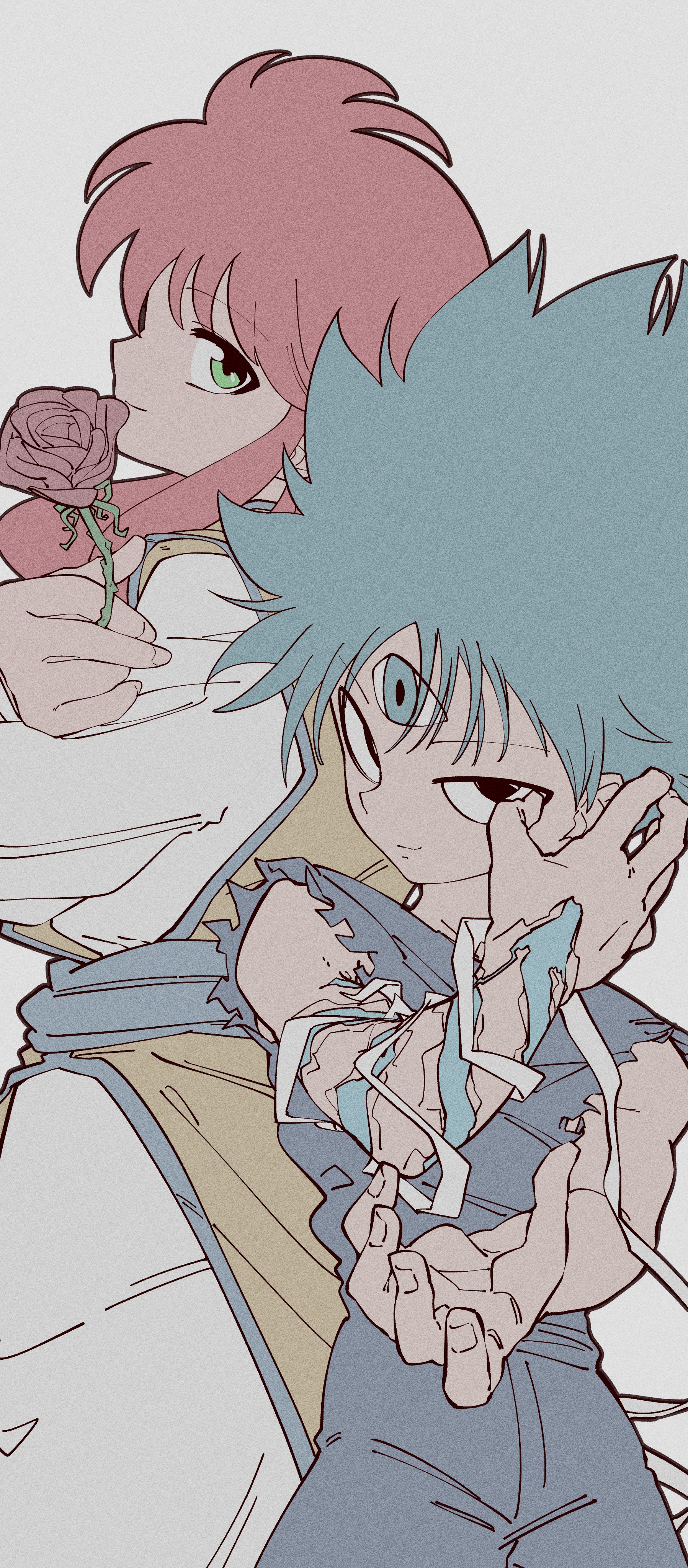 2boys absurdres arms_up bandaged_arm bandages black_pants black_shirt blue_hair blue_sash closed_mouth commentary cowboy_shot crossed_arms flower green_eyes hair_intakes hiei_(yu_yu_hakusho) highres holding holding_flower kogorooz kurama_(yu_yu_hakusho) looking_to_the_side male_focus multiple_boys outstretched_hand pants red_flower red_hair red_rose robe rose sash shirt sideways_glance simple_background sleeveless smile solid_oval_eyes spiked_hair untranslatable_commentary third_eye torn_clothes torn_sleeves white_background white_robe yuu_yuu_hakusho