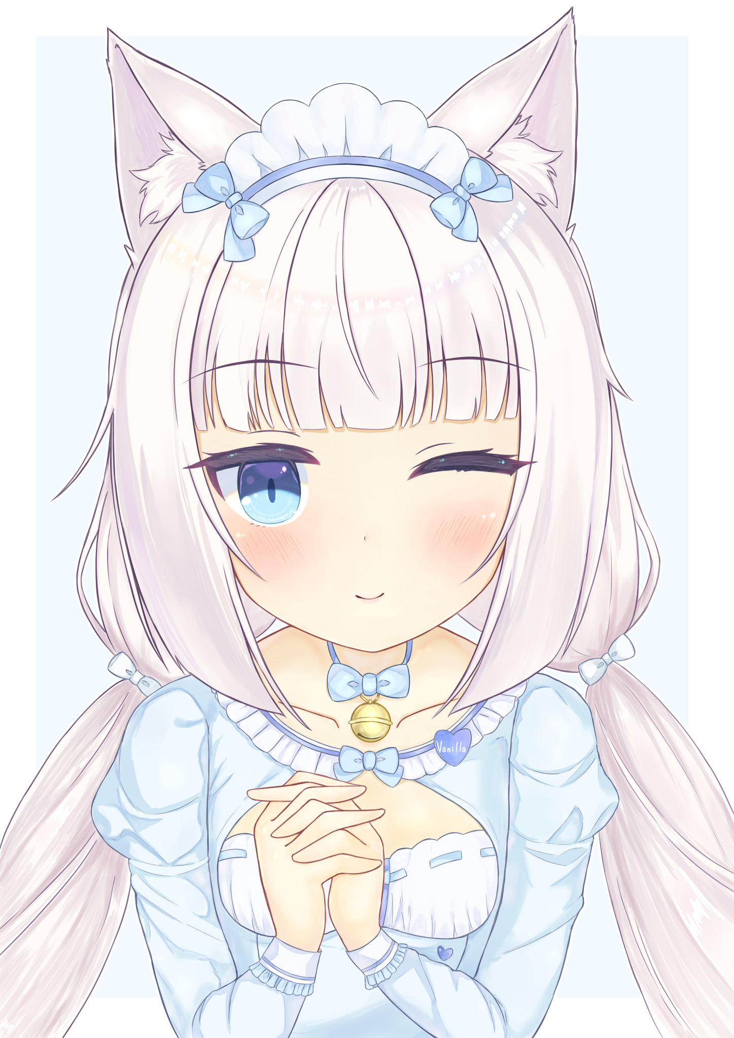 1girl animal_ear_fluff animal_ears bell blue_background blue_bow blue_dress blue_eyes blunt_bangs bow bow_choker breasts buttons cat_ears cat_girl chiyoi_(tiniyounoda) choker dress hair_bow heart heart_button highres long_hair looking_at_viewer low_twintails maid maid_headdress name_tag neck_bell nekopara one_eye_closed own_hands_together ribbon slit_pupils small_breasts smile twintails vanilla_(nekopara) white_bow white_hair wink
