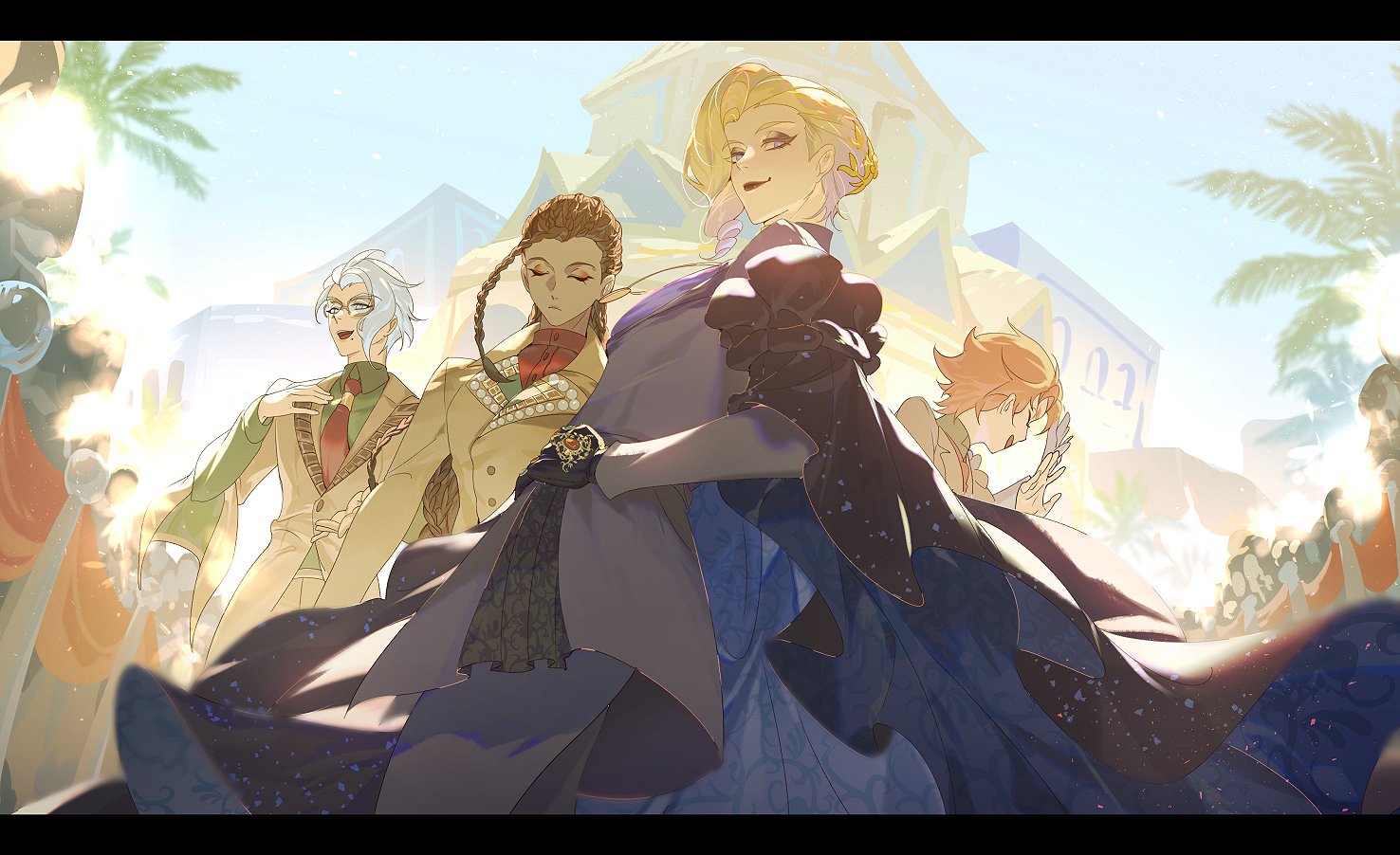 4boys ace_trappola ace_trappola_(luxe_couture) azul_ashengrotto azul_ashengrotto_(luxe_couture) blonde_hair brown_hair coat commentary_request cowboy_shot fishee_(fisheem4mmal) formal_clothes hand_on_own_hip jamil_viper jamil_viper_(luxe_couture) letterboxed long_hair looking_at_viewer male_focus multiple_boys orange_hair outdoors purple_eyes short_hair smile suit twisted_wonderland vil_schoenheit vil_schoenheit_(luxe_couture) white_hair