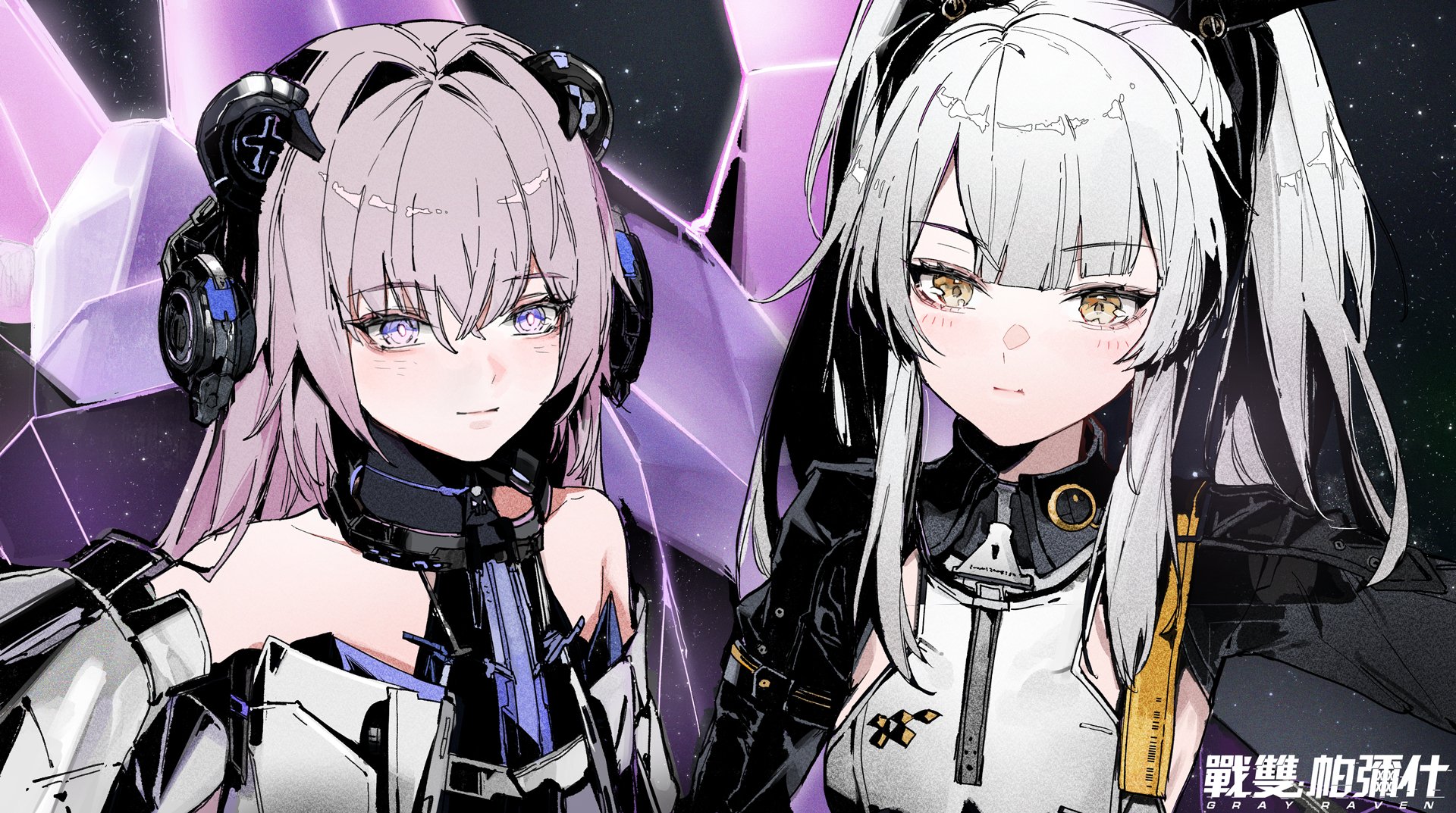 2girls bare_shoulders black_shrug breasts closed_mouth commentary detached_sleeves dress english_commentary hair_between_eyes hair_intakes headphones highres karenina:_scire_(pgr) karenina_(pgr) long_hair looking_at_viewer multiple_girls pink_hair pout punishing:_gray_raven purple_eyes secretfj520 shirt shrug_(clothing) sidelocks small_breasts smile teddy:_decryptor_(pgr) teddy_(pgr) twintails white_dress white_hair white_shirt white_sleeves yellow_eyes