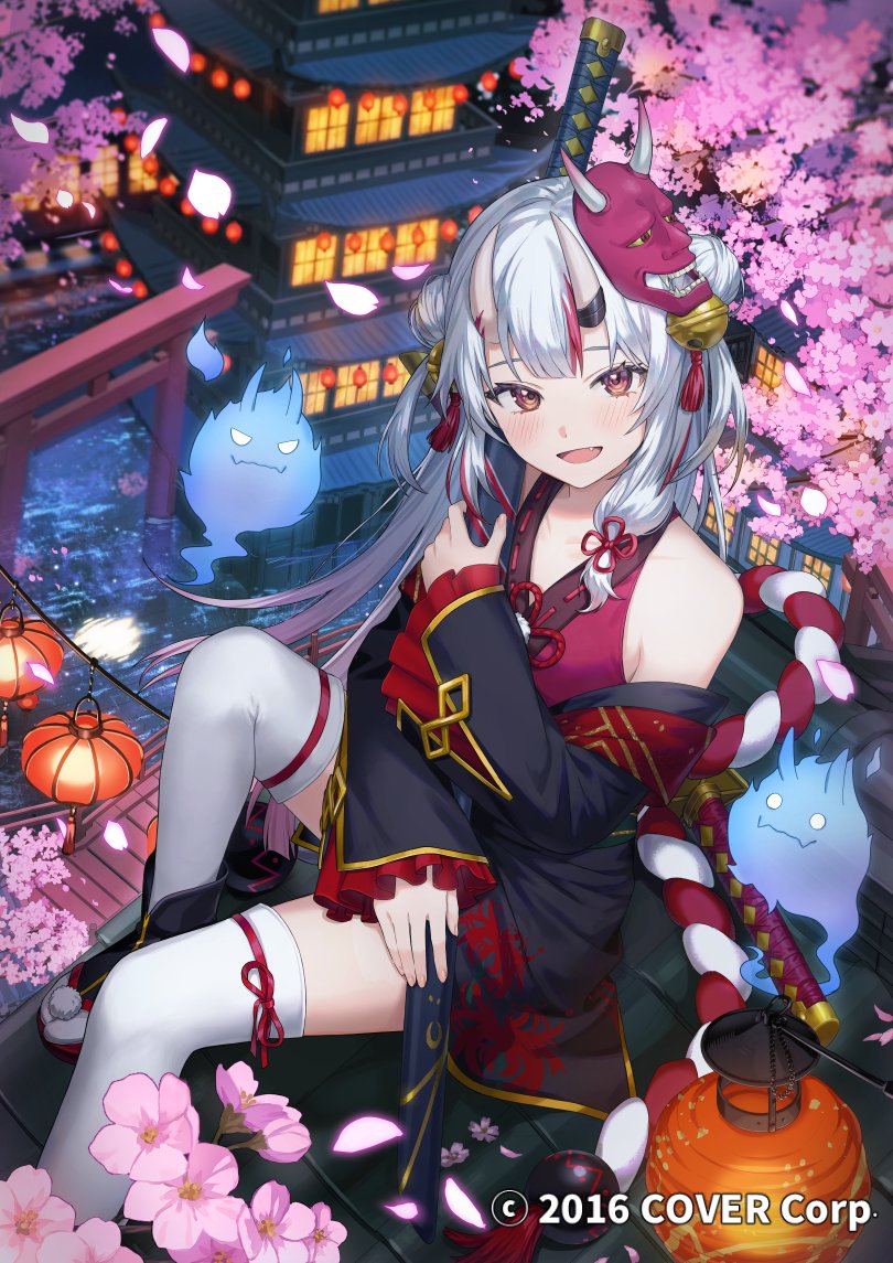 1girl :d bare_shoulders bell black_kimono blurry blush center-flap_bangs cherry_blossoms commentary_request copyright_notice depth_of_field double_bun falling_petals fang fingernails frilled_sleeves frills gold_trim gradient_hair hair_bell hair_bun hair_ornament hand_up hololive horns japanese_clothes jingle_bell karma_(nakiri_ayame) katana kimono knee_up kouhaku_nawa lantern long_hair long_sleeves looking_at_viewer mask mask_on_head multicolored_hair nakiri_ayame nakiri_ayame_(1st_costume) night off_shoulder official_art okobo oni oni_mask open_mouth outdoors petals platform_sandals red_eyes red_hair red_kimono red_sandals rope saino_misaki sandals sheath sheathed shimenawa shiranui_(nakiri_ayame) short_kimono side_up_bun sitting skin-covered_horns sleeveless sleeveless_kimono smile solo streaked_hair sword tabi tassel tassel_hair_ornament thighhighs torii two_side_up virtual_youtuber weapon white_hair white_thighhighs wide_sleeves