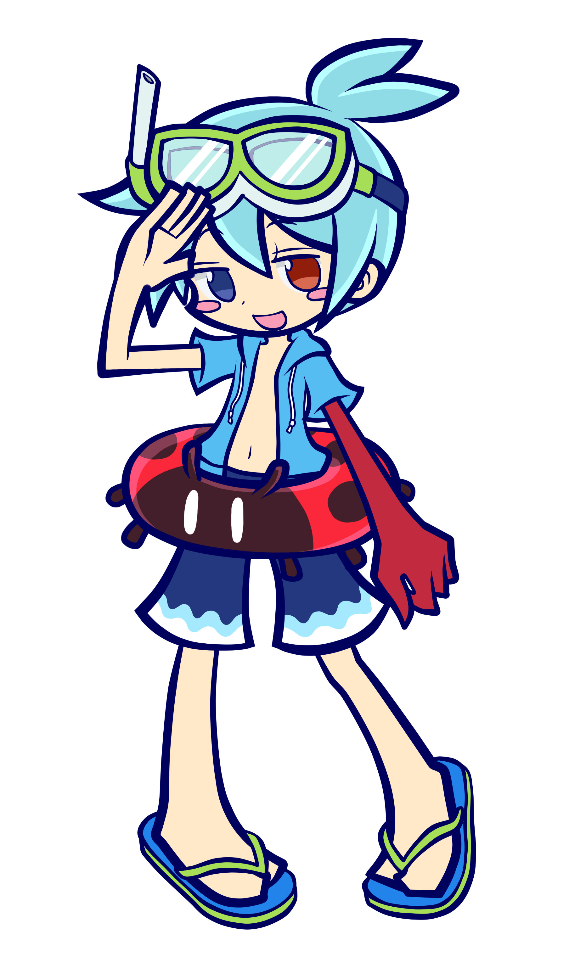 1boy :d absurdres antenna_hair arm_at_side arm_up asymmetrical_arms bare_pectorals blue_eyes blue_hair blue_sandals blue_shorts blush_stickers deformed dot_nose double-parted_bangs drawstring flip-flops full_body goggles green-framed_eyewear green_sandals happy heel_up heterochromia highres hood hoodie innertube jitome looking_ahead male_focus multicolored_shorts no_pupils official_style open_clothes open_hand open_hoodie open_mouth pectorals polka_dot polka_dot_innertube puyopuyo rara_(20rupi3) red_eyes sandals short_hair shorts sig_(puyopuyo) simple_background smile snorkel solo standing swim_ring tachi-e two-tone_sandals white_background