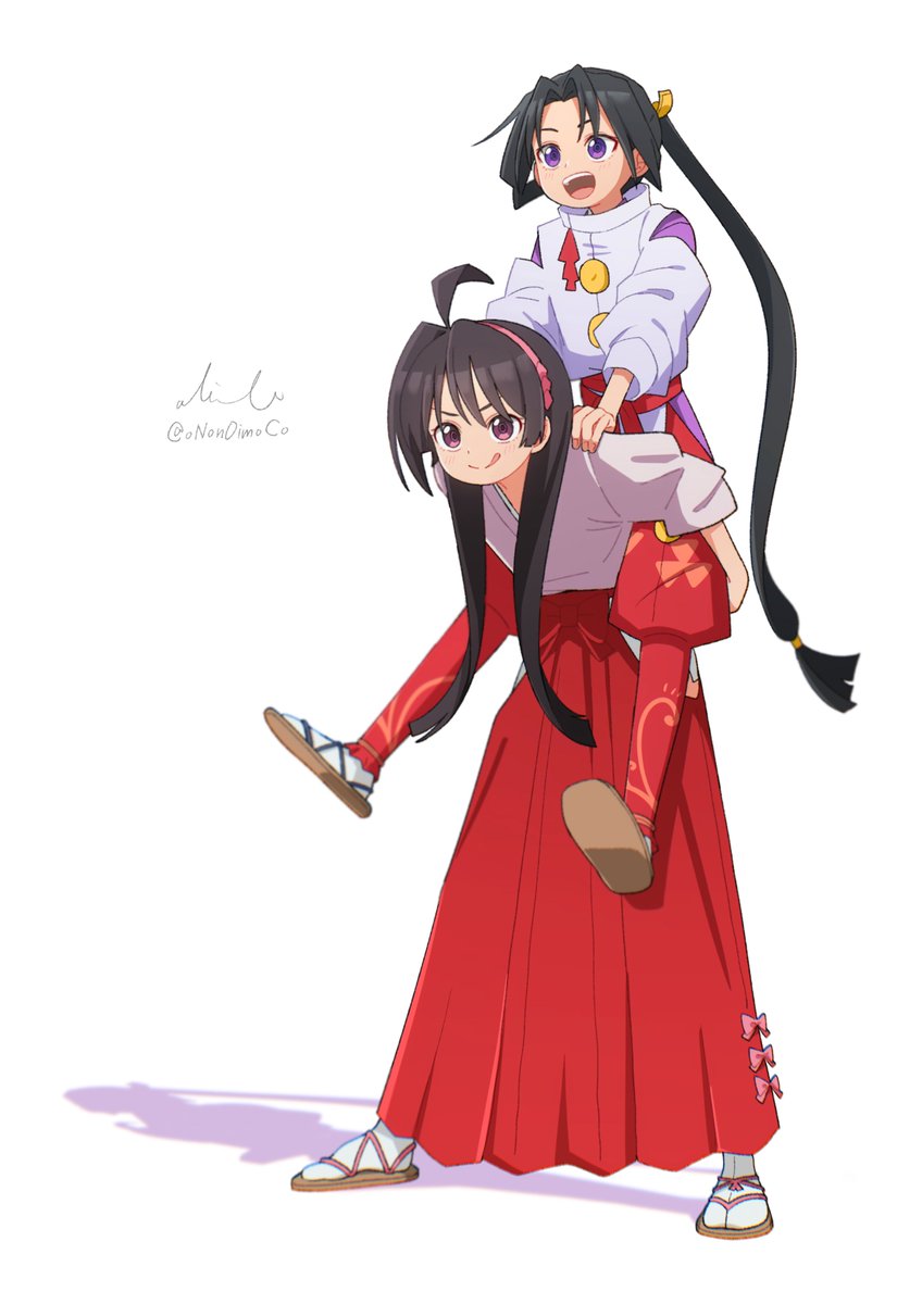 1boy 1girl ahoge black_hair carrying carrying_person hakama highres houjou_tokiyuki_(nige_jouzu_no_wakagimi) japanese_clothes kariginu kimono long_hair long_sleeves miko mochizuki_ayako nige_jouzu_no_wakagimi onon0imoco open_mouth parted_bangs ponytail purple_eyes sash sidelocks_tied_back simple_background smile very_long_hair white_background wide_sleeves