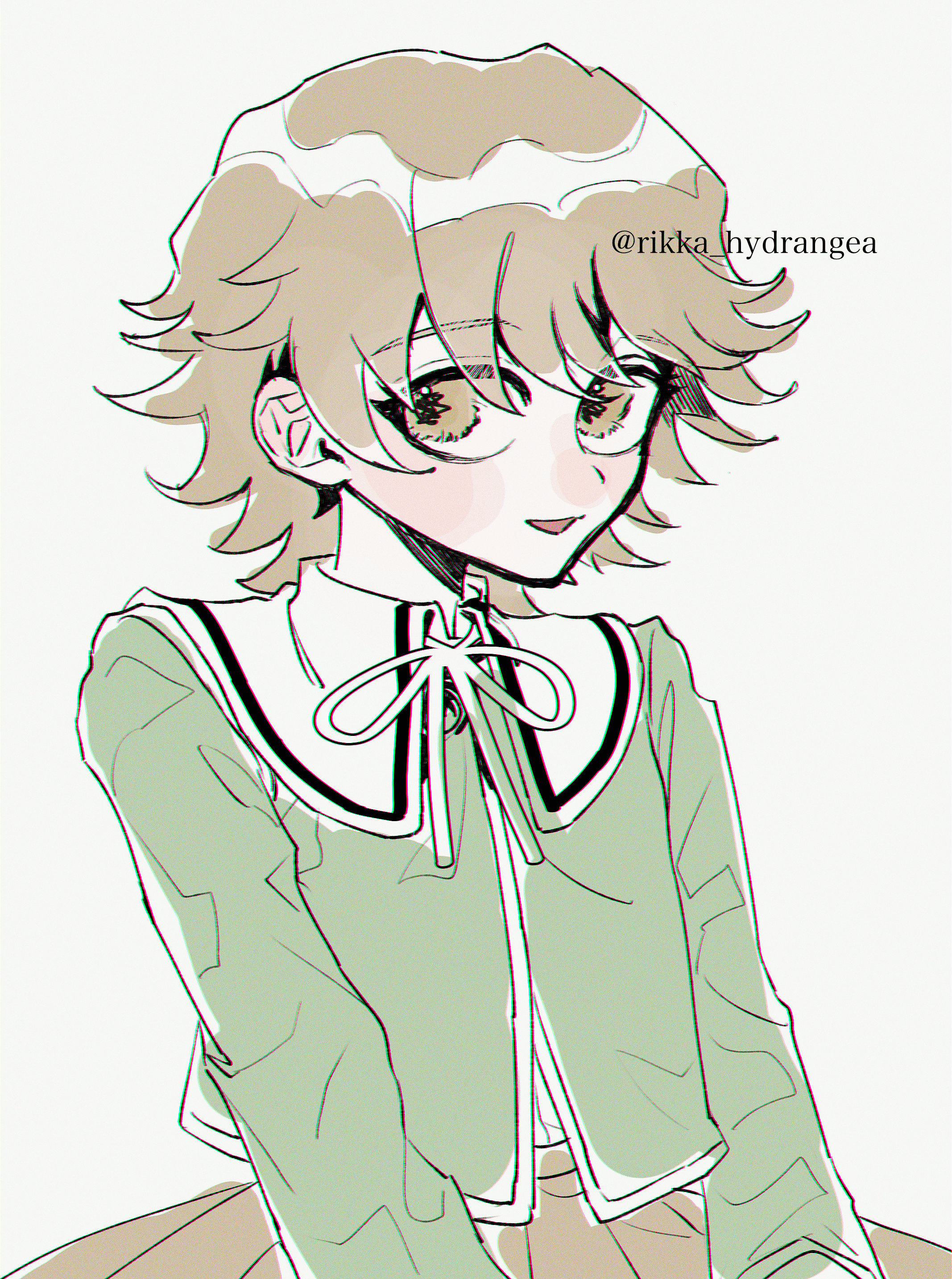 1boy :d absurdres artist_name blush brown_eyes brown_hair brown_skirt danganronpa:_trigger_happy_havoc danganronpa_(series) fujisaki_chihiro green_jacket highres jacket long_sleeves looking_at_viewer neck_ribbon open_mouth pleated_skirt ribbon shimaya short_hair skirt smile solo trap