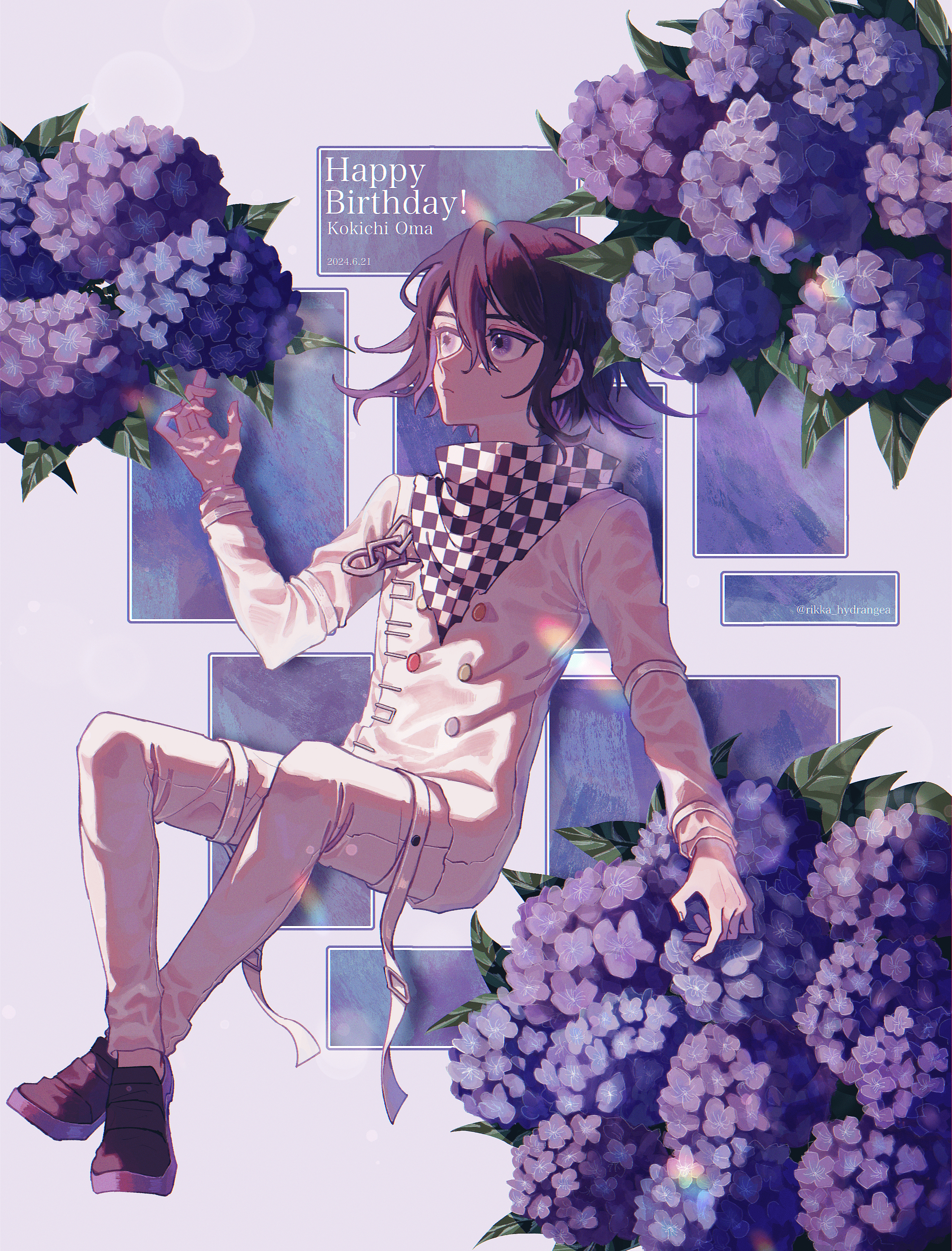 1boy absurdres black_hair black_shoes checkered_clothes checkered_scarf danganronpa_(series) danganronpa_v3:_killing_harmony flower hair_between_eyes happy_birthday highres invisible_chair long_sleeves male_focus medium_hair oma_kokichi pants pink_eyes purple_flower revision scarf shimaya shoes sitting solo
