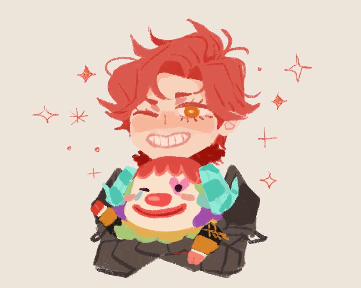 2boys animal_crossing armor armored_gloves carrying clown commentary cropped_torso crossed_arms crossover english_commentary fire_emblem fire_emblem:_three_houses fur-trimmed_armor fur_trim gloves grin heart horns makeup male_focus multiple_boys nintendo one_eye_closed orange_hair pietro_(animal_crossing) red_fur red_hair red_lips sheep_horns simple_background smile sparkle spearmintaii sylvain_jose_gautier teeth white_background