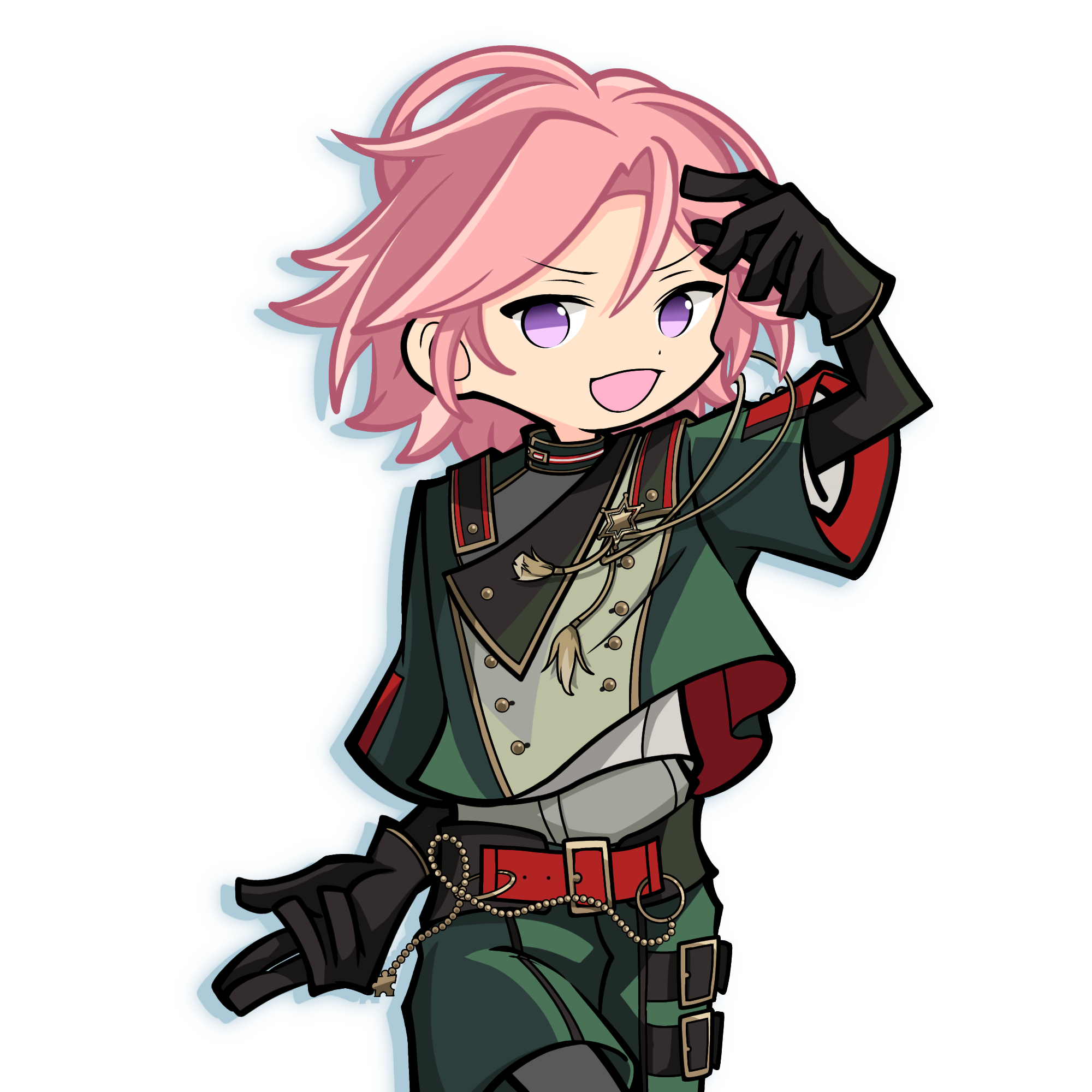 1boy aiguillette arm_at_side arm_up belt belt_buckle wallet_chain black_gloves buckle cowboy_shot crossed_legs curtained_hair deformed drop_shadow ensemble_stars! gloves green_jacket green_shorts highres jacket layered_sleeves long_sleeves looking_at_viewer male_focus medium_hair multiple_belts no_pupils open_mouth otakumodoki oukawa_kohaku parody pink_hair purple_eyes puyopuyo puyopuyo_20th_anniversary red_belt short_over_long_sleeves short_sleeves shorts simple_background solo style_parody thigh_belt thigh_strap transparent_background turning_head two-sided_sleeves watson_cross wind