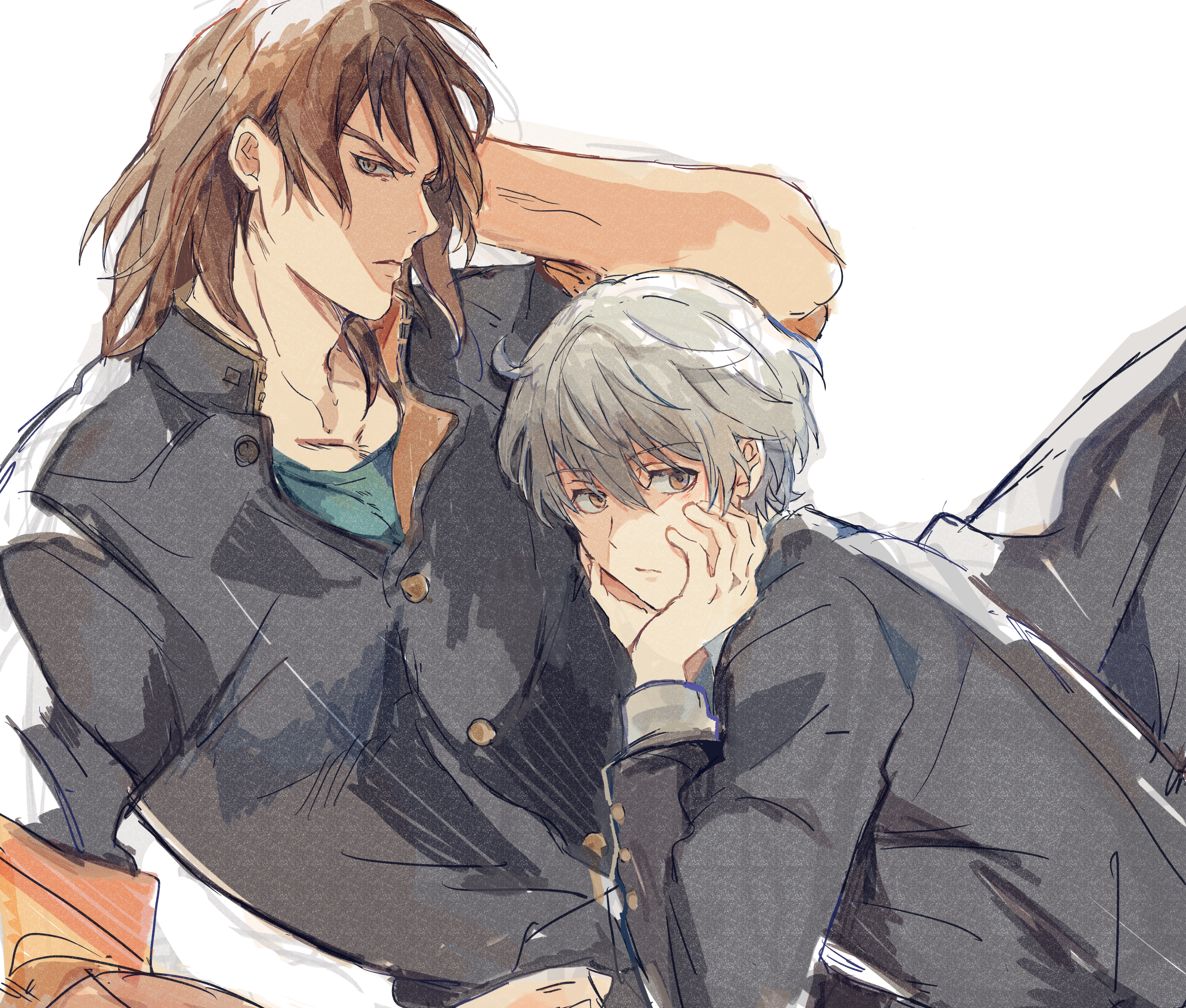 2boys absurdres arm_up brown_eyes brown_hair gakuran grey_eyes highres hijiyama_takatoshi juusan_kihei_bouei_ken looking_at_viewer male_focus multiple_boys muscular muscular_male okino_tsukasa pectoral_cleavage pectorals school_uniform simple_background sleeves_rolled_up thick_eyebrows toramaru_(696anna) white_background white_hair