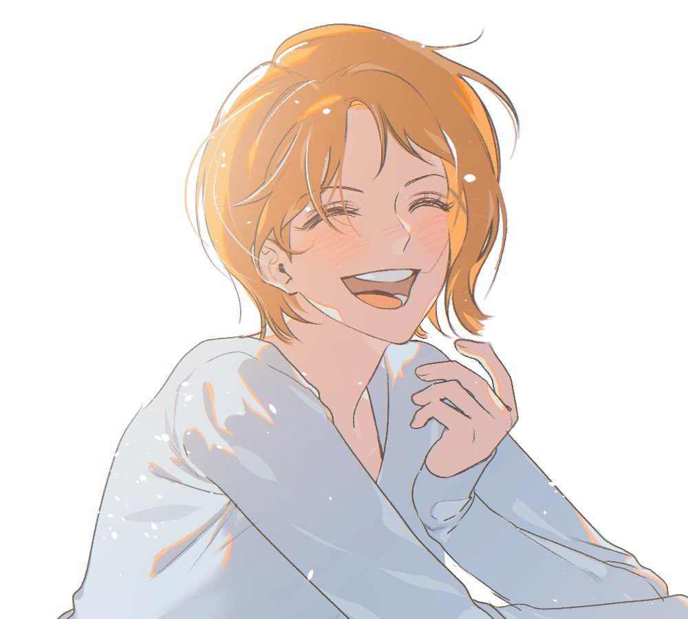 1girl blush closed_eyes facing_viewer hand_up happy light_particles long_sleeves nami_(one_piece) one_piece open_mouth orange_hair ppyobong11 shirt short_hair smile solo upper_body white_background white_shirt