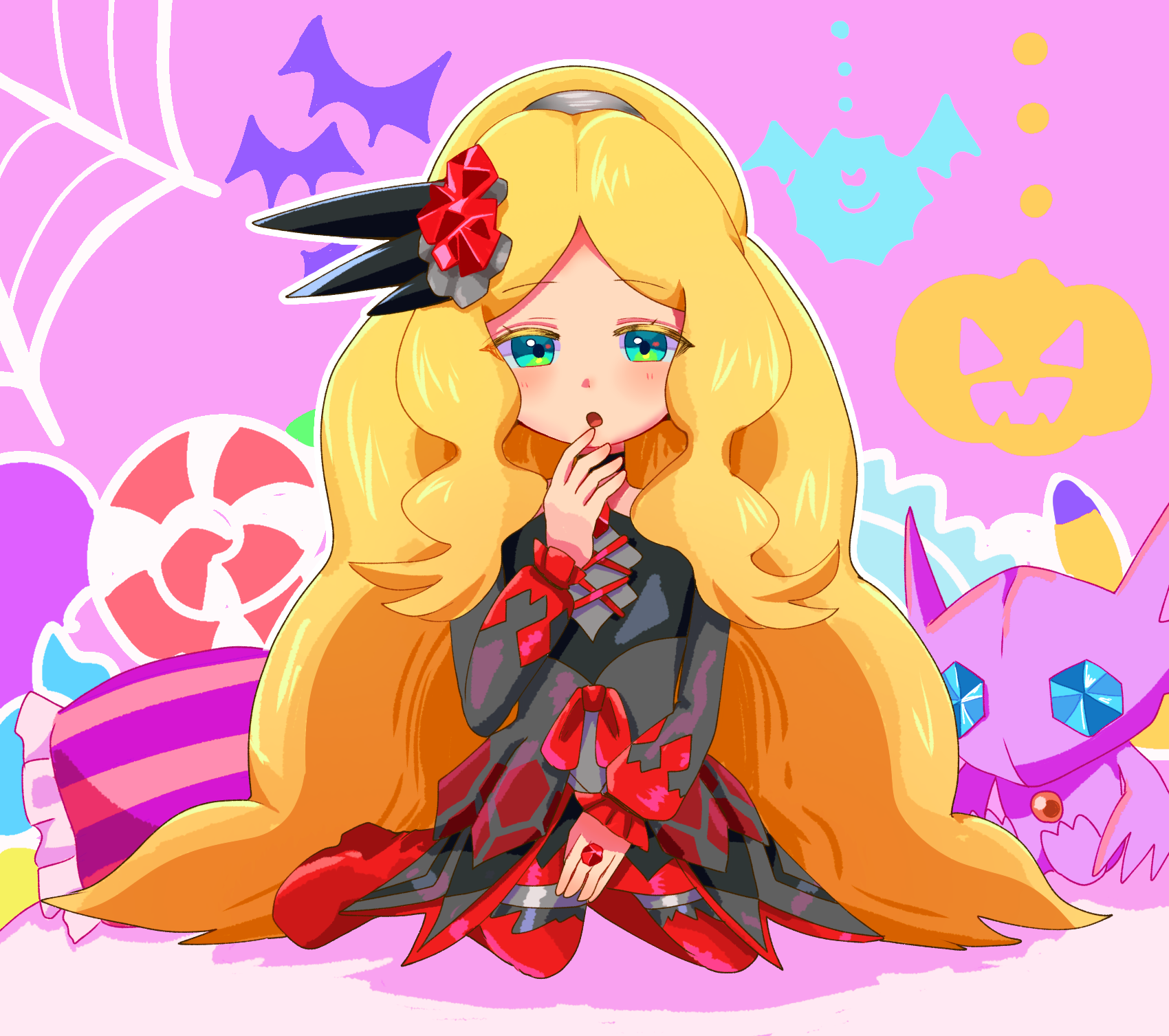 black_dress blonde_hair blue_eyes caitlin_(fall_2021)_(pokemon) caitlin_(pokemon) candy dress food gen_3_pokemon highres komejirushi_(mjex2458) lollipop long_hair looking_at_viewer nintendo official_alternate_costume outline pokemon pokemon_(creature) pokemon_masters_ex sableye silk spider_web very_long_hair white_outline
