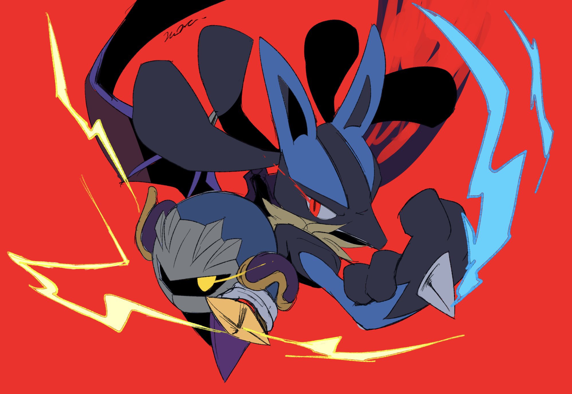armor furry galaxia_(sword) gen_4_pokemon highres holding holding_sword holding_weapon kirby_(series) looking_at_another lucario mask meta_knight nintendo pauldrons pokemon pokemon_(creature) red_background rune_(ruupokesmash54) shoulder_armor simple_background super_smash_bros. sword weapon yellow_eyes