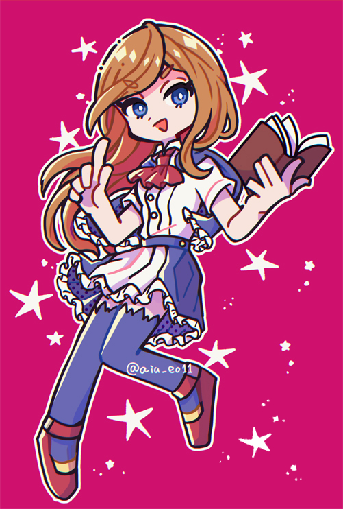 1girl artist_name ascot blue_eyes blue_thighhighs book brown_hair castlevania:_portrait_of_ruin castlevania_(series) charlotte_aulin holding holding_book long_hair oimo_(motu_club) open_mouth pink_background red_ascot red_footwear shirt simple_background skirt smile star_(symbol) thighhighs white_shirt
