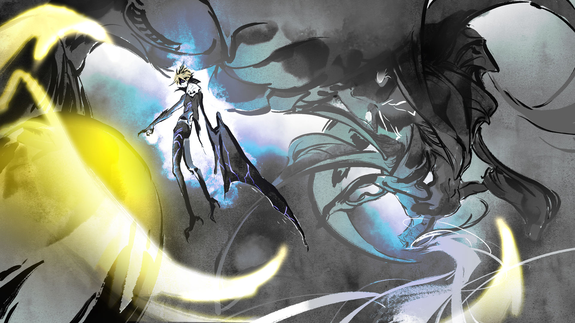 1boy armor bahamut_(final_fantasy) bare_shoulders black_bodysuit black_mask black_wings blonde_hair bodystocking bodysuit clawed_feet cloud_strife cloud_strife_(bahamut_garb) dragon_wings enjoutoru eye_mask facing_to_the_side final_fantasy final_fantasy_vii final_fantasy_vii:_ever_crisis floating full_body highres male_focus mask official_alternate_costume outstretched_arm pointing shoulder_armor single_wing spiked_hair wings