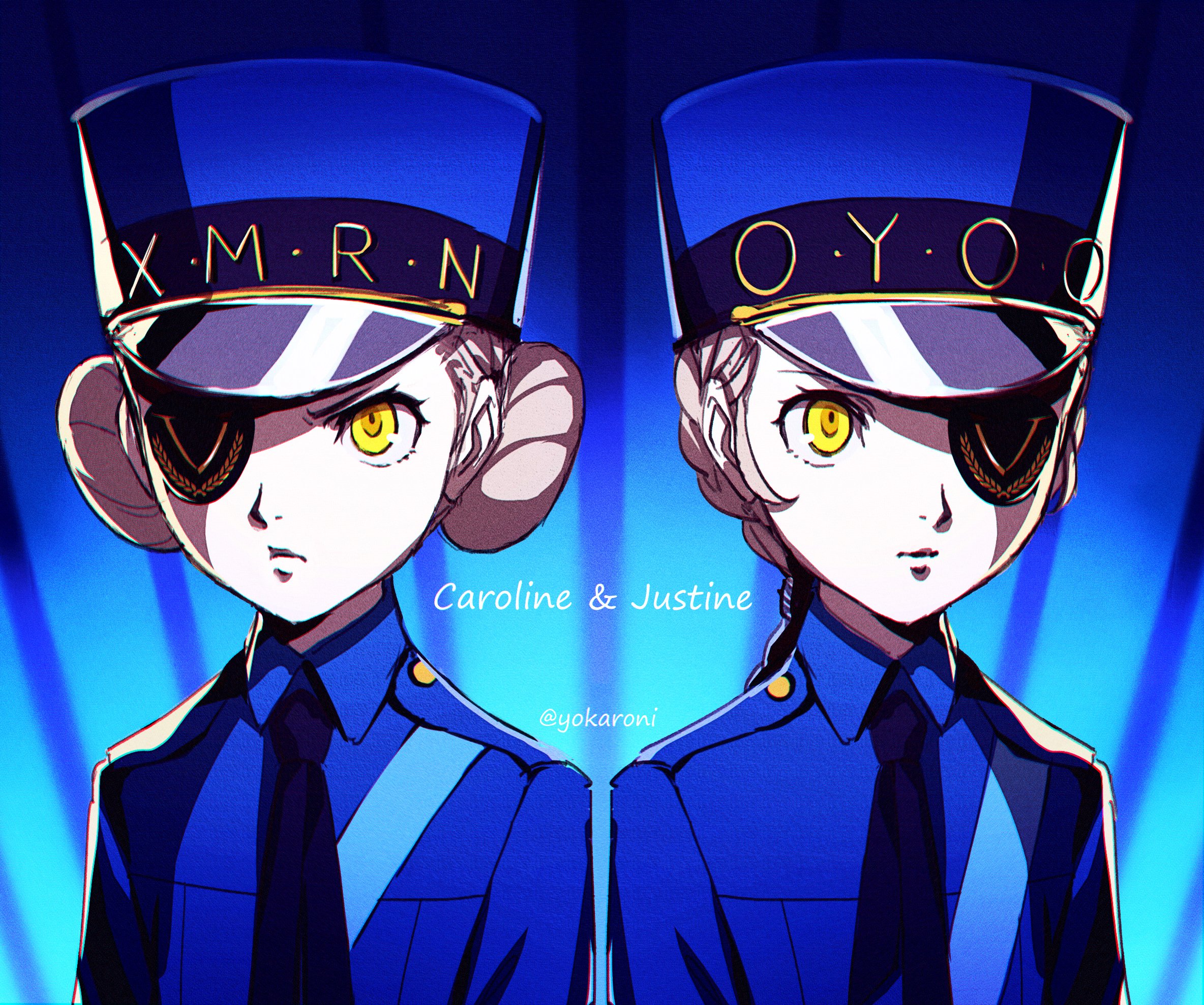 2girls black_necktie blue_hat blue_shirt caroline_(persona_5) character_name closed_mouth collared_shirt commentary_request double_bun eyepatch grey_hair hair_bun hat highres justine_(persona_5) multiple_girls necktie persona persona_5 shirt siblings twins twitter_username upper_body yellow_eyes yokaroni