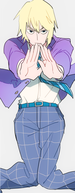 1boy belt blonde_hair blue_belt blue_eyes blue_necktie feet_out_of_frame grey_background hair_between_eyes hanazawa_teruki jacket knees_together_feet_apart male_focus mari-mason mob_psycho_100 necktie outstretched_arms pants plaid_clothes plaid_pants purple_jacket shirt short_hair solo striped_clothes striped_necktie white_shirt