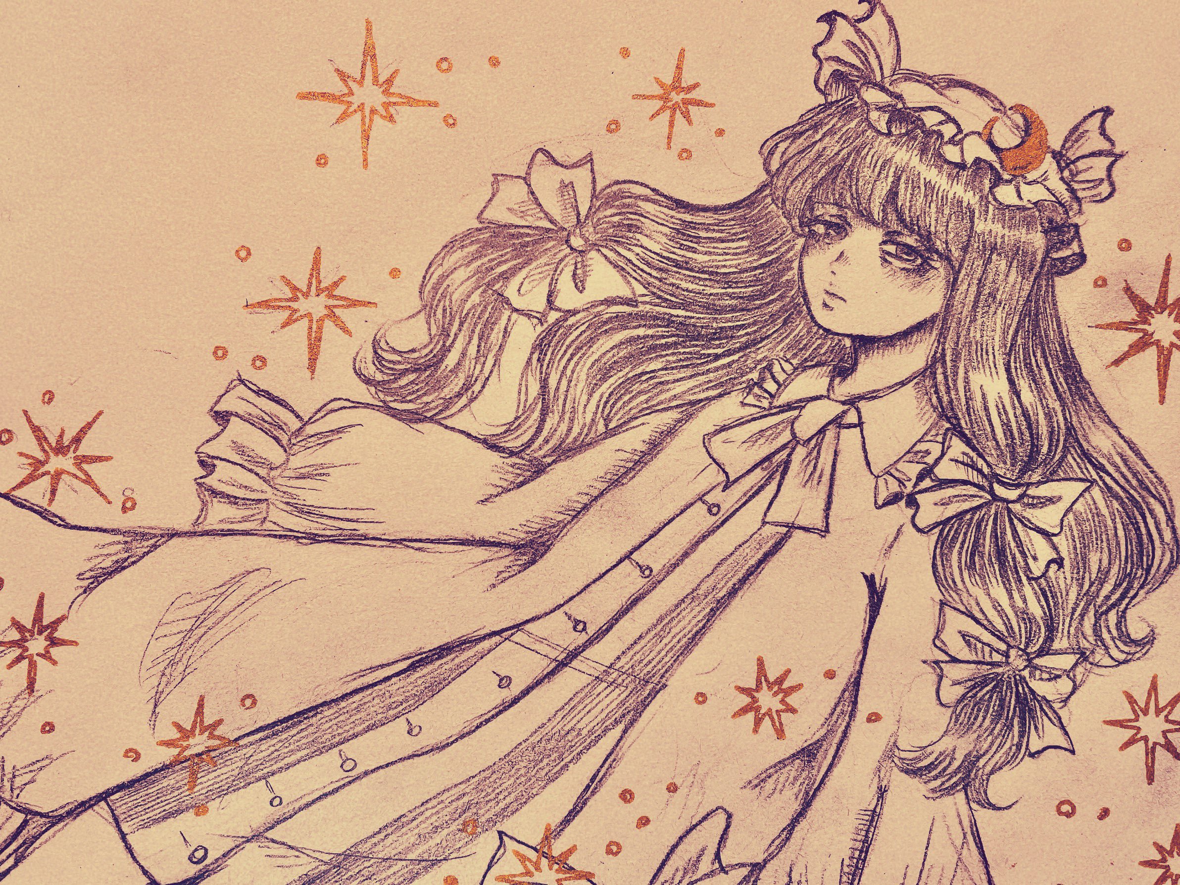 1girl brown_theme crescent crescent_hat_ornament hair_ribbon hat hat_ornament highres long_hair looking_at_viewer mob_cap neri_namgal outline patchouli_knowledge purple_outline ribbon solo sparkle touhou yellow_outline