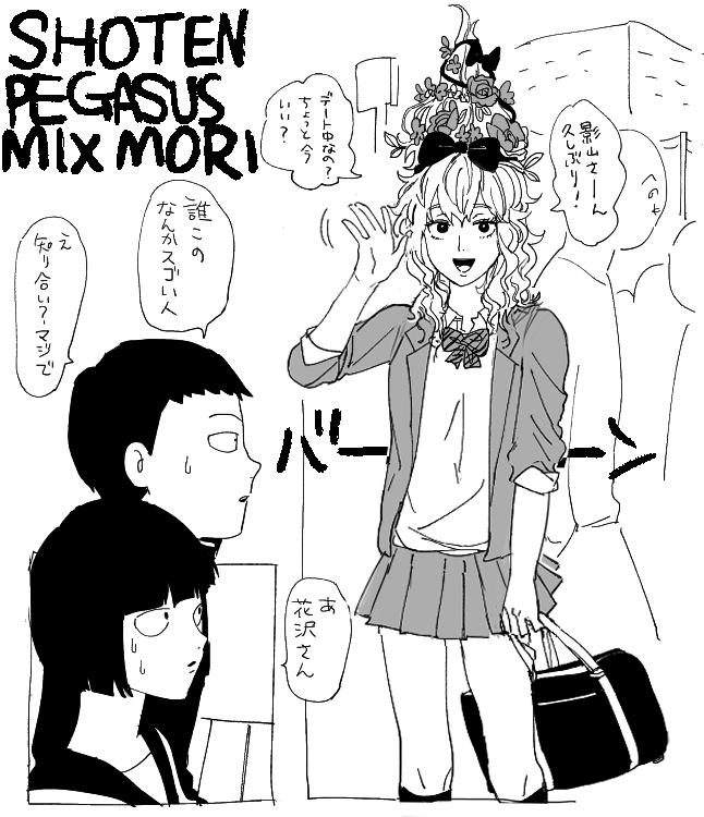 1boy 2girls bag bow collared_shirt flower genderswap genderswap_(ftm) genderswap_(mtf) greyscale hair_flower hair_ornament hanazawa_teruki holding holding_bag jacket kageyama_shigeo kurata_tome long_sleeves mari-mason mob_psycho_100 monochrome multiple_girls open_mouth pleated_skirt shirt skirt socks speech_bubble striped_bow translation_request