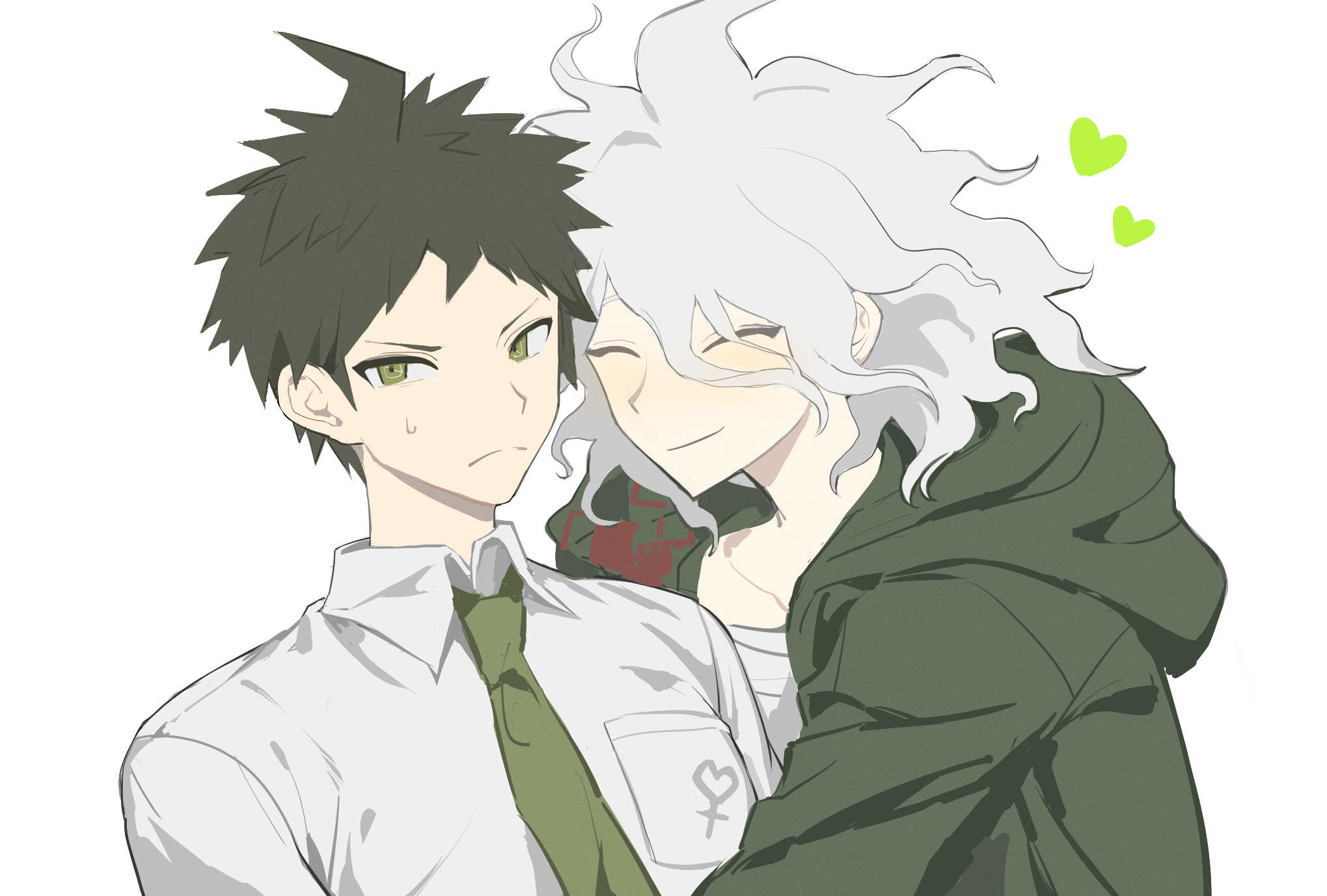 2boys ahoge badge blush breast_pocket brown_hair casssstle12 closed_eyes closed_mouth danganronpa_(series) danganronpa_2:_goodbye_despair green_jacket green_necktie grey_hair heart highres hinata_hajime hood hood_down hug jacket komaeda_nagito male_focus multiple_boys necktie pocket short_hair simple_background smile spiked_hair sweatdrop upper_body white_background yaoi