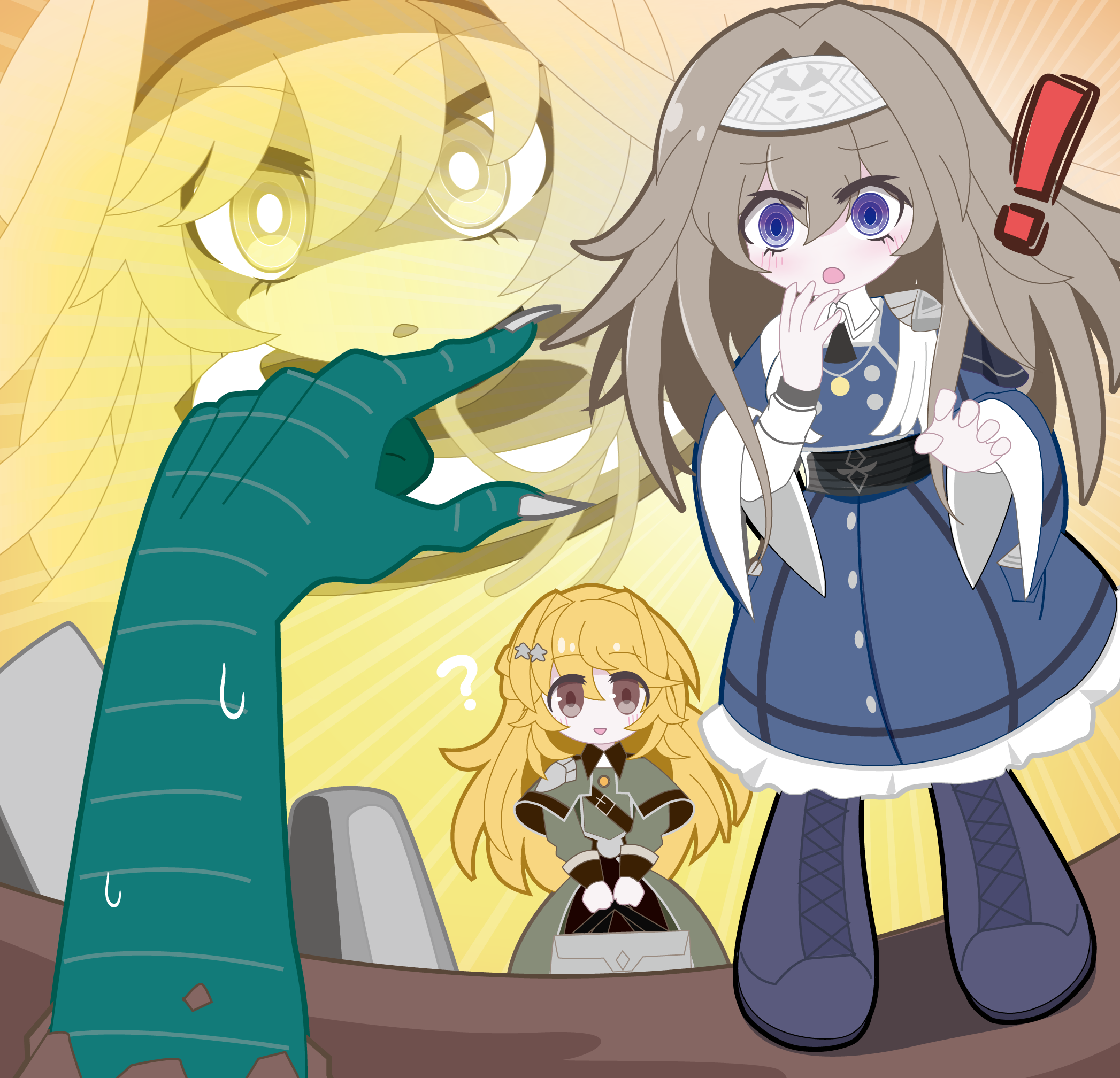 ! 1other 2girls ? angry blonde_hair blue_eyes called_by_the_grave chibi colored_skin derivative_work dress duel_monster exosister_elis exosister_gibrine exosister_irene gameplay_mechanics green_dress green_skin grey_hair headband highres multiple_girls parody pointing pointing_at_another surprised tombstone yosu_(surume-ika) yu-gi-oh!