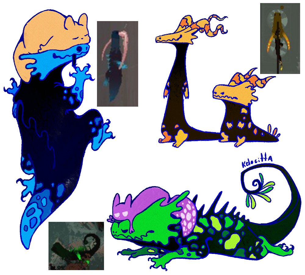 angry blue_lizard_(rain_world) claws creature dragon feathers game_screenshot gourmand_(rain_world) green_feathers green_lizard_(rain_world) half-closed_eyes happy kelocitta lizard lizard_(rain_world) monster noodlefly_(rain_world) rain_world reference_inset signature size_difference slugcat spearmaster_(rain_world) tongue tongue_out white_background white_eyes yellow_lizard_(rain_world)