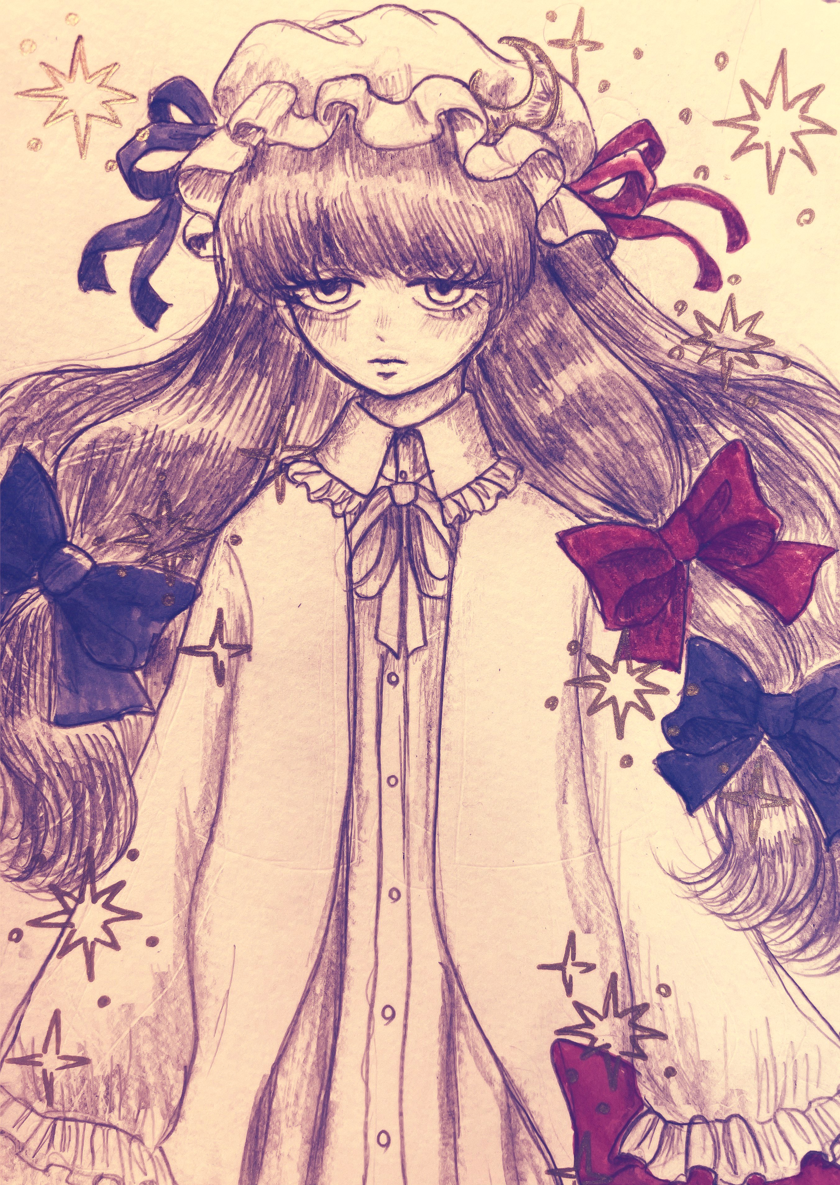 1girl absurdres blue_ribbon crescent crescent_hat_ornament hair_ribbon hat hat_ornament highres long_hair looking_at_viewer mob_cap neri_namgal patchouli_knowledge red_ribbon ribbon solo sparkle touhou