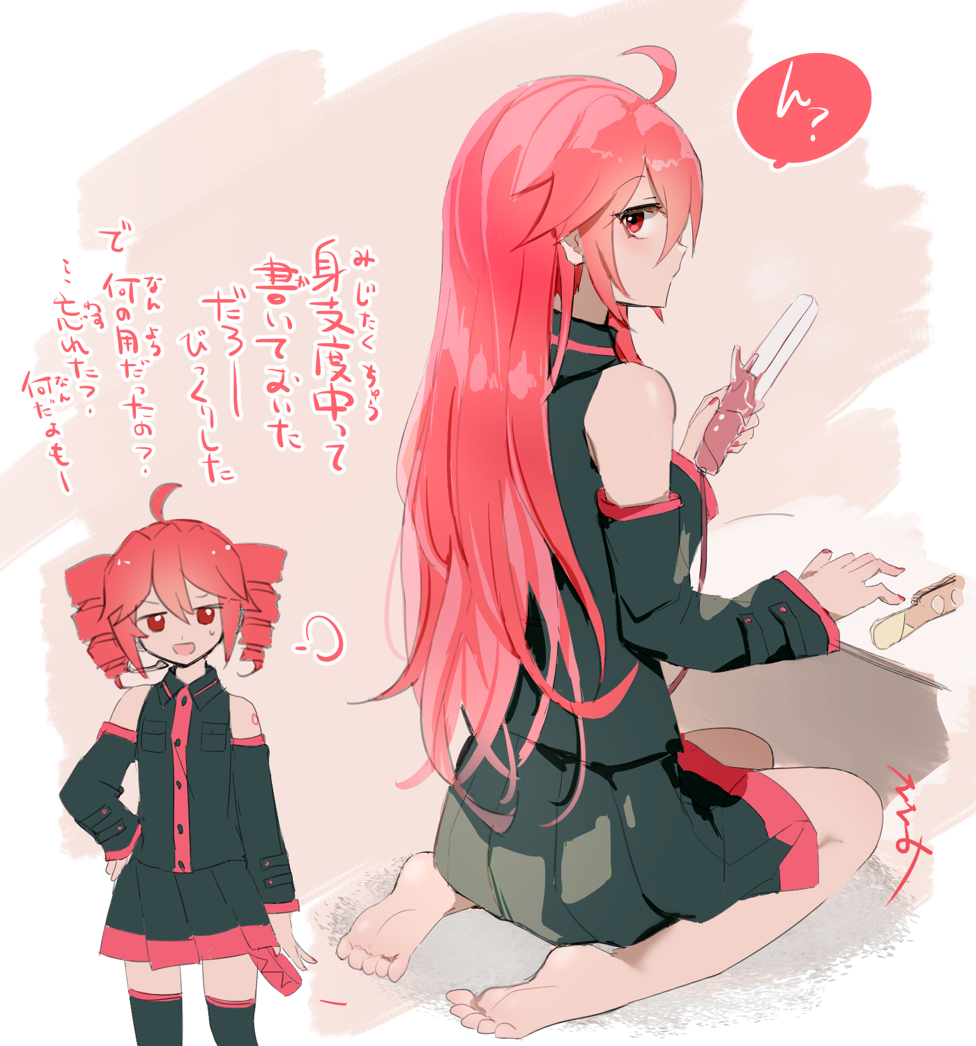 ? ahoge alternate_hairstyle barefoot black_shirt black_skirt black_sleeves black_thighhighs buttons collared_shirt cowboy_shot detached_sleeves drill_hair feet fingernails from_behind from_side full_body hair_brush hand_on_own_hip headset highres holding kasane_teto kasane_teto_(utau) kneeling long_hair pink_background pleated_skirt red_hair red_nails red_trim shirt skirt skirt_set sleeveless sleeveless_shirt speech_bubble sweatdrop thighhighs torino_sasami translated twin_drills utau white_background zettai_ryouiki