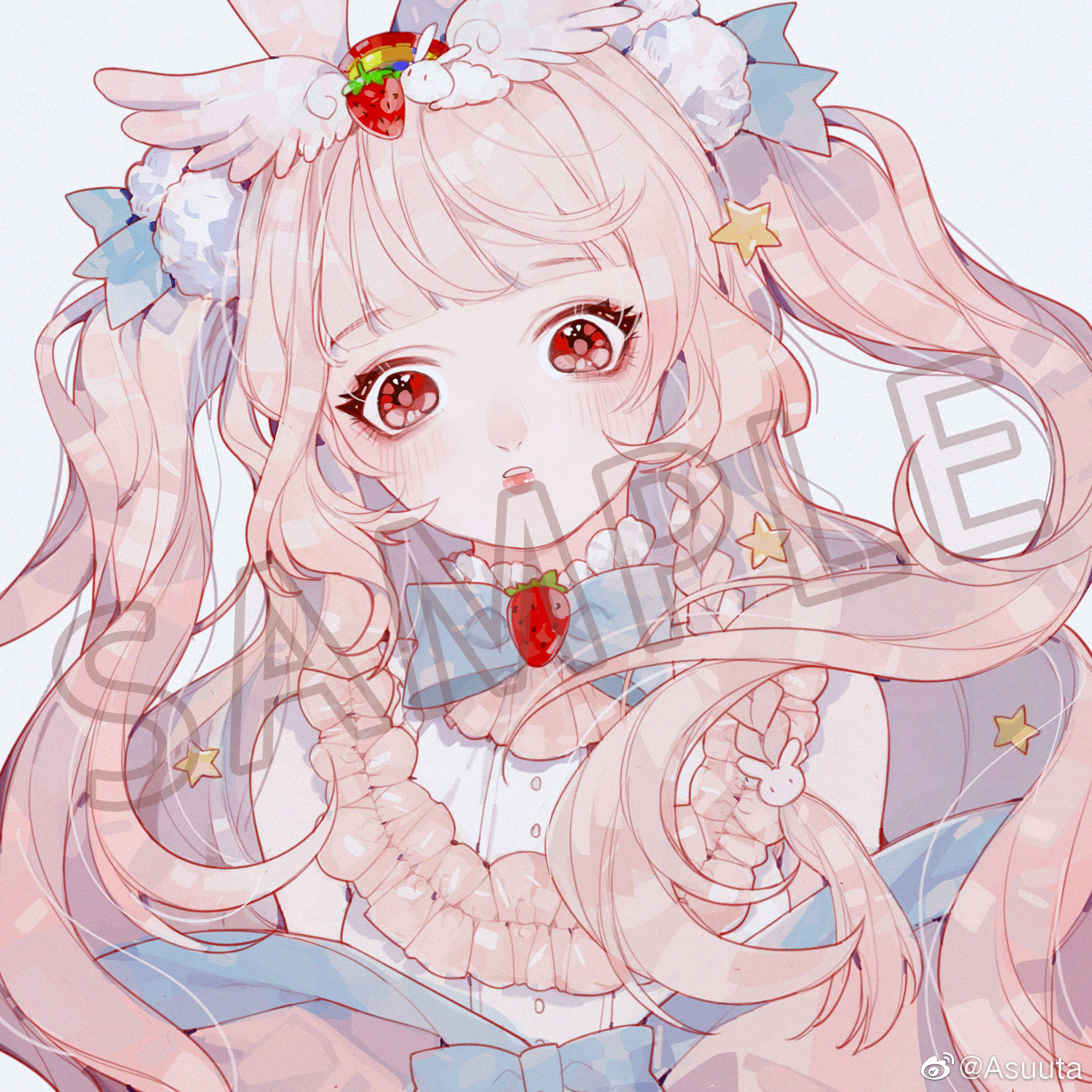1girl asuuta bare_shoulders blonde_hair blouse blue_bow blue_bowtie blue_ribbon blue_shawl blunt_bangs bow bowtie braid brooch buttons chinese_commentary collared_shirt commentary_request commission expressionless eyelashes eyeshadow food-themed_hair_ornament frilled_shirt frills grey_background hair_ornament hair_ribbon high_collar highres jewelry light_blush lipstick long_hair loose_hair_strand makeup original parted_lips pink_eyeshadow pom_pom_(clothes) pom_pom_hair_ornament rabbit_hair_ornament rainbow_hair_ornament red_eyes red_lips ribbon sample_watermark shawl shirt simple_background single_braid sleeveless sleeveless_shirt solo star_(symbol) star_hair_ornament strawberry_brooch strawberry_hair_ornament teeth twintails upper_body very_long_hair waist_bow watermark weibo_watermark white_shirt wing_hair_ornament