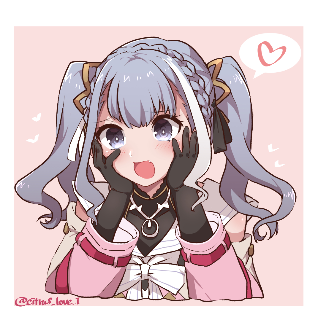 1girl atelier_(series) atelier_ryza atelier_ryza_2 black_gloves blue_eyes blue_hair blush border braid commentary_request cropped_torso gloves hands_on_own_cheeks hands_on_own_face hands_up haruna_(citrus_love_i) heart jacket jewelry long_hair multicolored_hair necklace open_mouth outside_border patricia_abelheim pink_background pink_jacket sidelocks solo spoken_heart streaked_hair twintails upper_body white_border white_hair