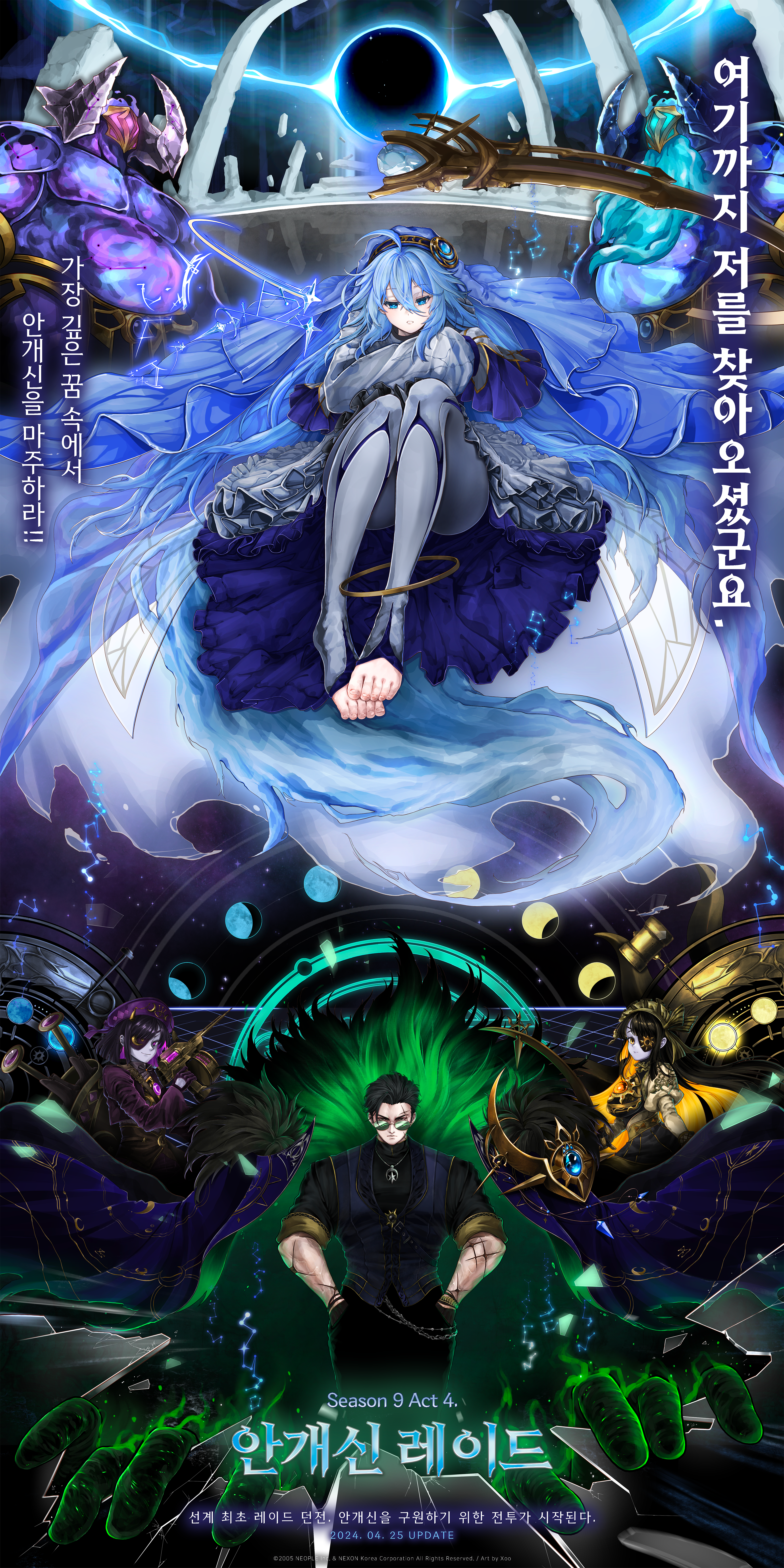 1boy 1girl 2girls 3girls absurdres ahoge aura black_hair black_pants black_shirt blonde_hair blue_eyes blue_gem blue_hair chain character_request closed_mouth cloud colored_inner_hair colored_skin commentary_request cowboy_shot crown dress dungeon_and_fighter expressionless eyepatch fire floating_hair frilled_dress frills frown full_body gem glasses golem green-tinted_eyewear green_fire grey_pantyhose grey_shirt grey_skin grey_skirt grey_vest hair_between_eyes hands_in_pockets highres holding jewelry korean_commentary korean_text long_bangs long_hair looking_at_viewer lopez_(dungeon_and_fighter) mu_(dungeon_and_fighter) multicolored_hair multiple_girls muscular muscular_male nail_gun necklace orange_gem pants pantyhose parted_lips purple_eyes purple_gem purple_hair purple_skin scar scar_on_arm shirt short_hair skirt sky smile sparkle star_(sky) starry_sky stirrup_legwear tinted_eyewear toeless_legwear toenails toes translation_request very_long_hair vest xoo_(pixiv_100957810) yellow_eyes