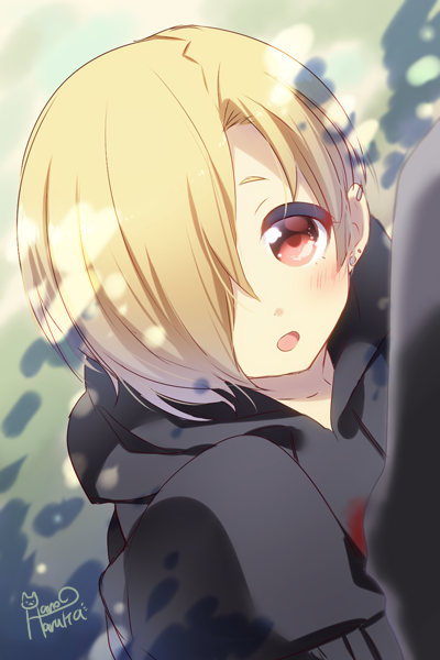 1girl 1other black_hoodie blonde_hair blush collarbone dot_nose ear_piercing green_background hair_over_one_eye hand_up hano_haruka hood hood_down hoodie idolmaster idolmaster_cinderella_girls idolmaster_cinderella_girls_starlight_stage looking_at_viewer open_mouth piercing red_eyes shirasaka_koume short_hair signature sleeves_past_fingers sleeves_past_wrists solo_focus
