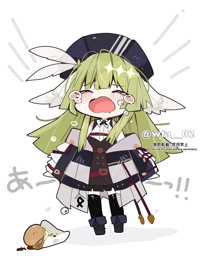 1girl :o arknights arms_at_sides black_corset black_hat blush burger chibi chibi_only closed_eyes corset crying dropped_food facing_viewer food full_body green_hair hat hat_feather head_wings itsuki_02 jacket long_bangs notice_lines off_shoulder open_clothes open_jacket open_mouth poncirus_(arknights) shirt sleeveless sleeveless_shirt solo twitter_username watermark white_jacket white_shirt wings