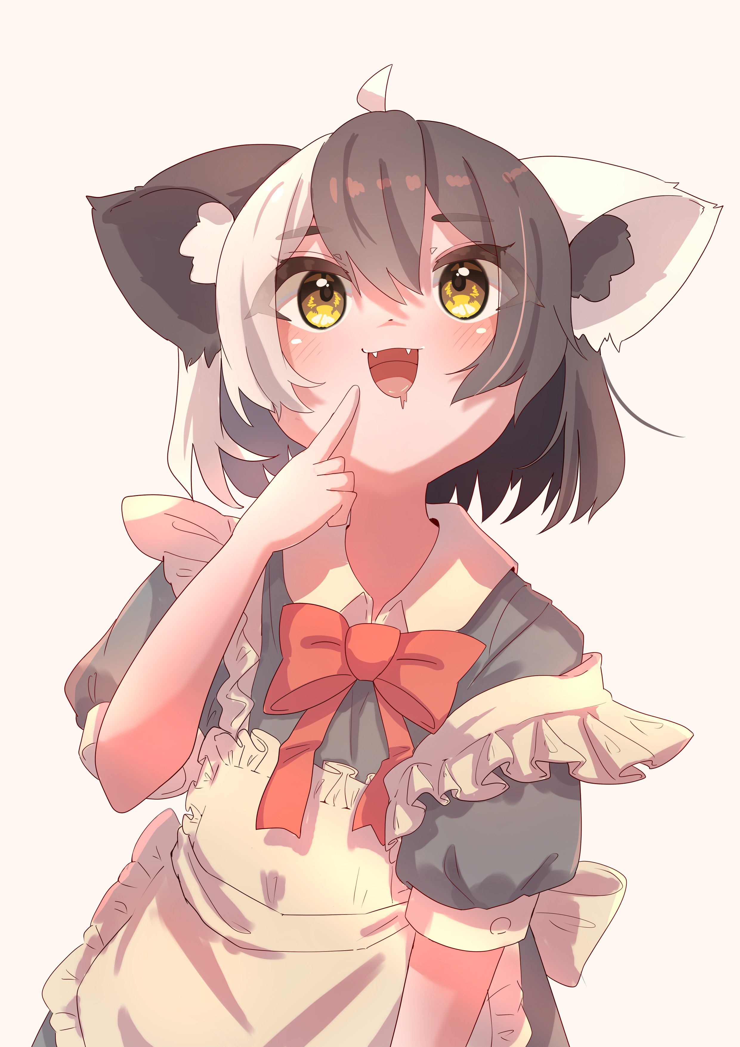 1girl :d absurdres animal_ears apron black_hair bow bowtie cat_ears cat_girl dress drooling fangs fangs_out finger_to_mouth grey_dress highres kotatsune maid maid_apron mouth_drool multicolored_hair open_mouth original puffy_short_sleeves puffy_sleeves red_bow red_bowtie short_sleeves smile strap_slip two-tone_hair white_apron white_background white_hair yellow_eyes