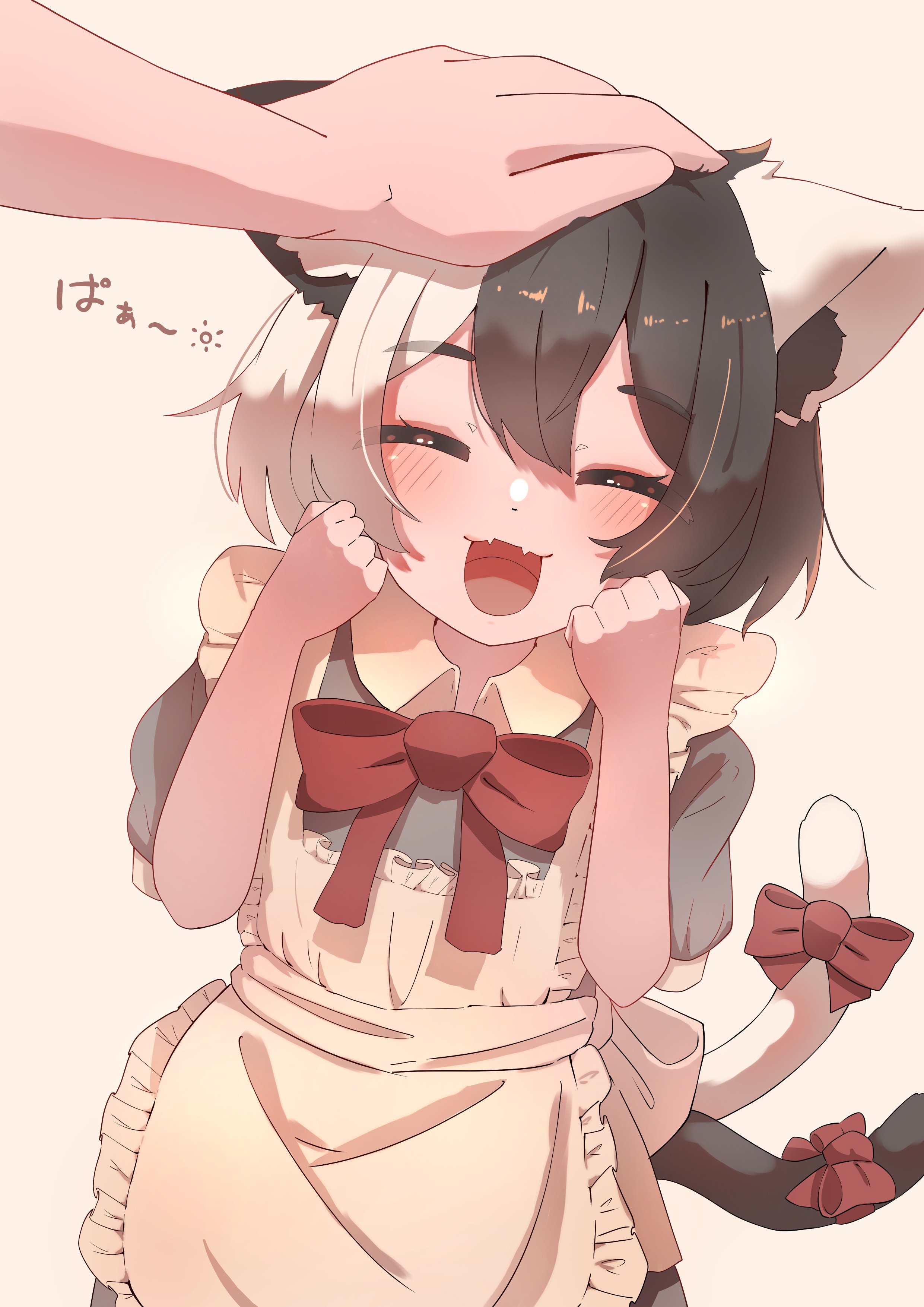 1girl :d ^_^ absurdres animal_ears apron black_hair bow bowtie cat_ears cat_girl cat_tail closed_eyes dress fangs fangs_out grey_dress hand_on_another's_head happy highres kotatsune maid maid_apron multicolored_hair multiple_tails open_mouth original petting puffy_short_sleeves puffy_sleeves red_bow red_bowtie short_hair short_sleeves skin_fangs smile tail tail_bow tail_ornament two-tone_hair two_tails white_apron white_hair