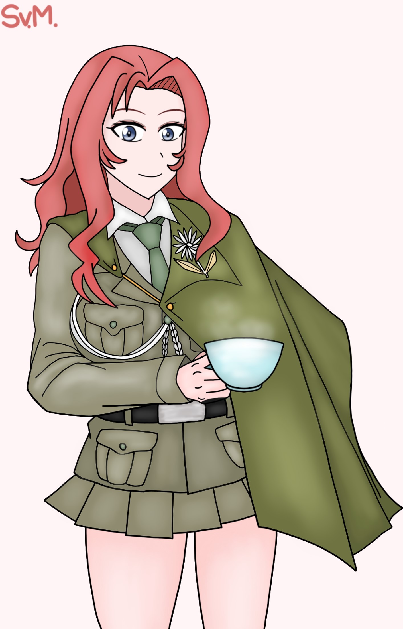 1girl belt black_necktie bonple_military_uniform collared_shirt cup girls_und_panzer highres holding holding_cup jacket maiko_(girls_und_panzer) miniskirt necktie red_hair seobaibeolmaen shirt skirt smile white_shirt