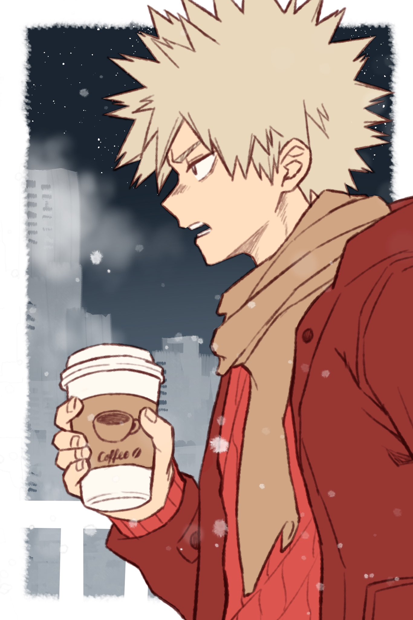 1boy arm_up bakugou_katsuki blonde_hair boku_no_hero_academia border building commentary cup disposable_coffee_cup disposable_cup dwun_pubg fence highres holding holding_cup jacket looking_ahead male_focus night open_clothes open_jacket open_mouth orange_eyes outside_border profile red_jacket red_sweater scarf sky snow solo sweater teeth upper_body white_border winter yellow_scarf