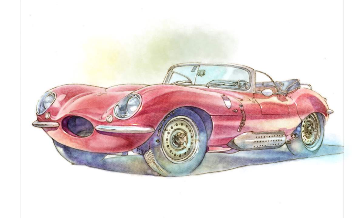 asai_takashi car colored_pencil_(medium) convertible jaguar_(car) jaguar_xkss motor_vehicle no_humans original red_car traditional_media vehicle_focus white_background