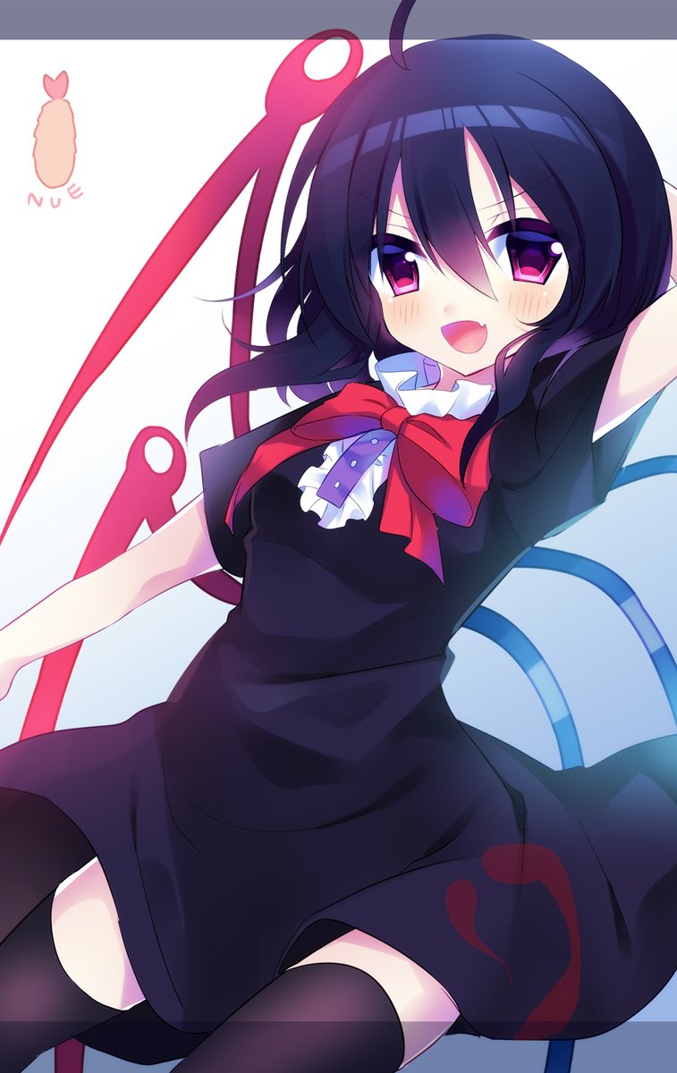 1girl asymmetrical_wings black_dress black_hair black_thighhighs blue_wings bow bowtie center_frills dress frills highres houjuu_nue kujou_mikuru looking_at_viewer red_bow red_bowtie red_eyes red_wings short_hair short_sleeves simple_background solo thighhighs touhou wings