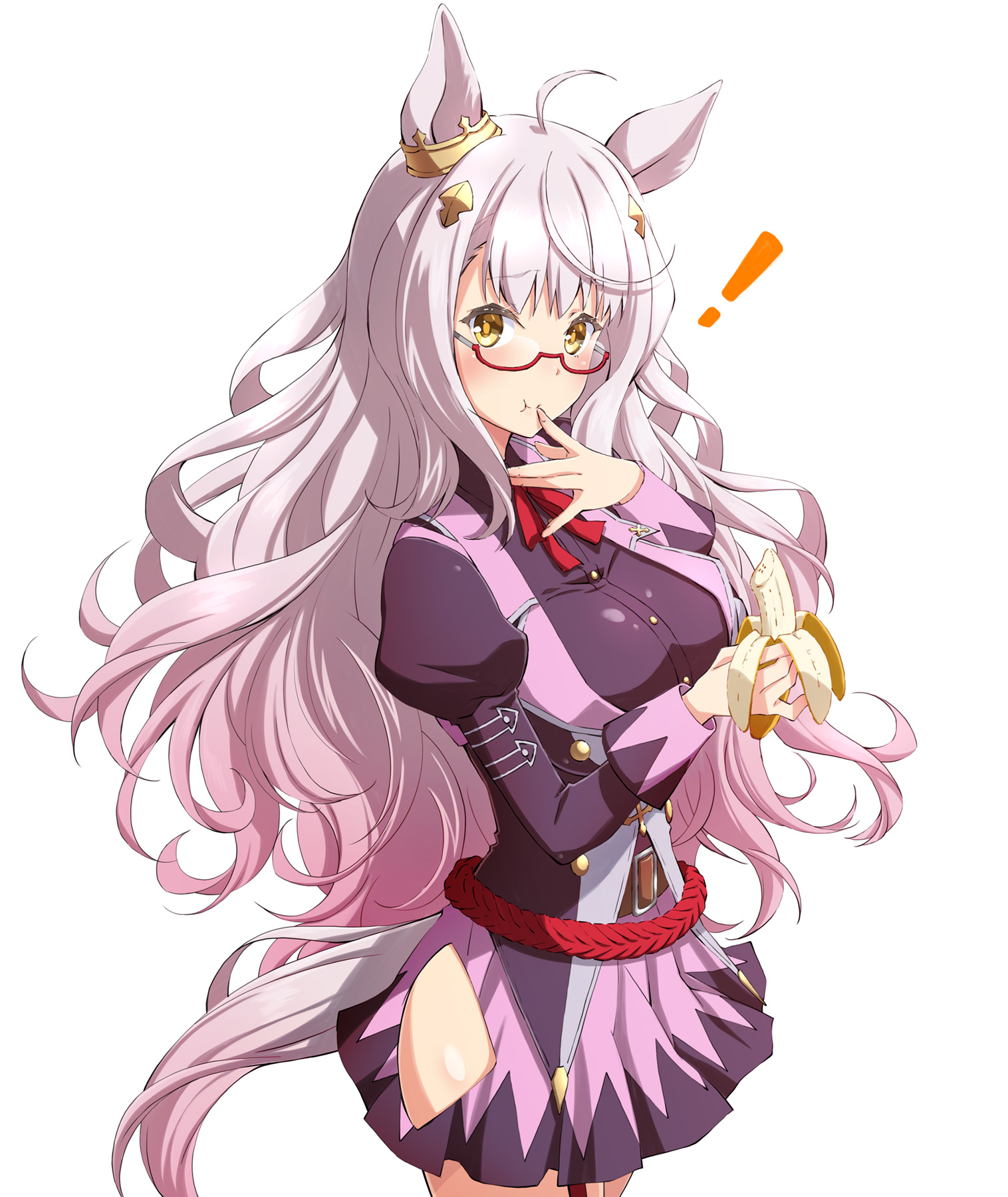 ! 1girl ahoge animal_ears banana biwa_hayahide_(umamusume) blush breasts clothing_cutout commentary_request eating food fruit glasses grey_hair highres hip_vent horse_ears horse_girl horse_tail izumi_mahiru juliet_sleeves long_hair long_sleeves looking_at_viewer medium_breasts puffy_sleeves red-framed_eyewear semi-rimless_eyewear simple_background skirt solo tail umamusume white_background yellow_eyes