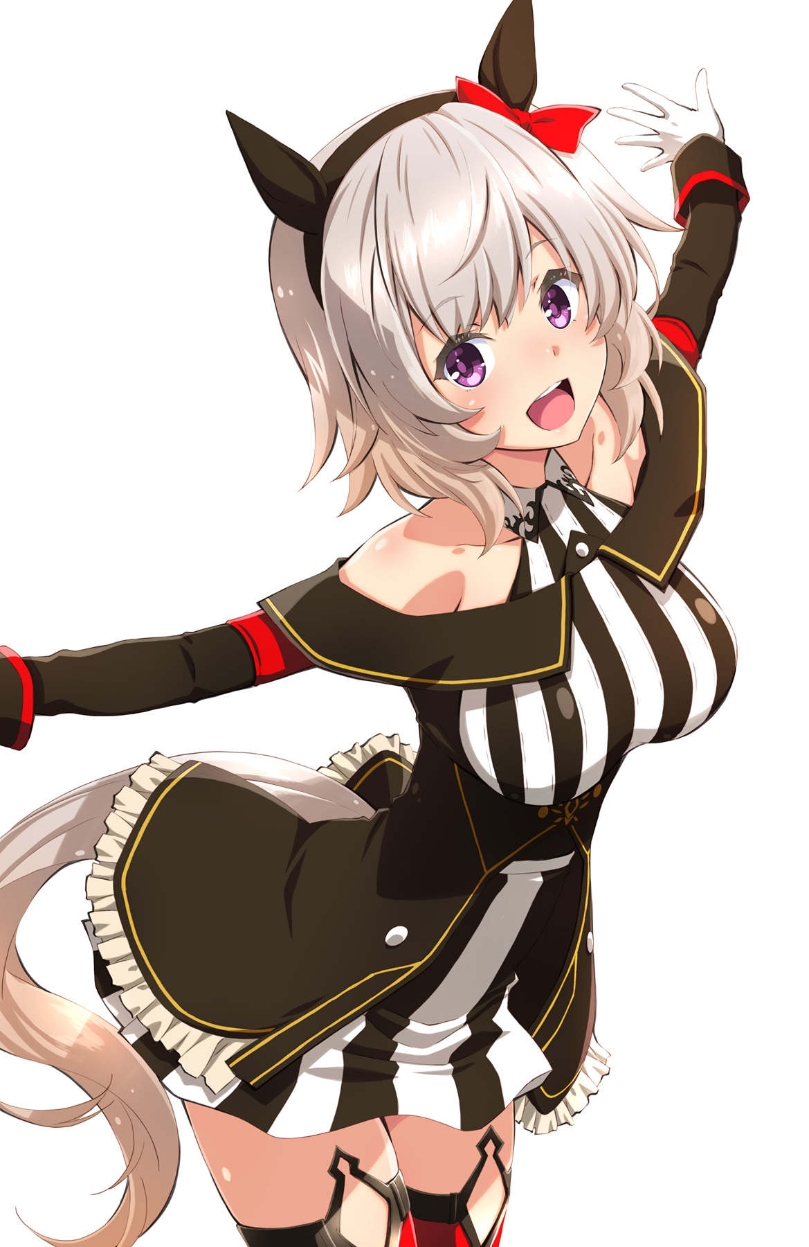 1girl animal_ears bare_shoulders blush breasts commentary_request curren_chan_(umamusume) dress grey_hair hairband highres horse_ears horse_girl horse_tail izumi_mahiru jacket looking_at_viewer medium_breasts open_mouth outstretched_arms purple_eyes short_hair simple_background smile solo spread_arms tail thighhighs umamusume white_background
