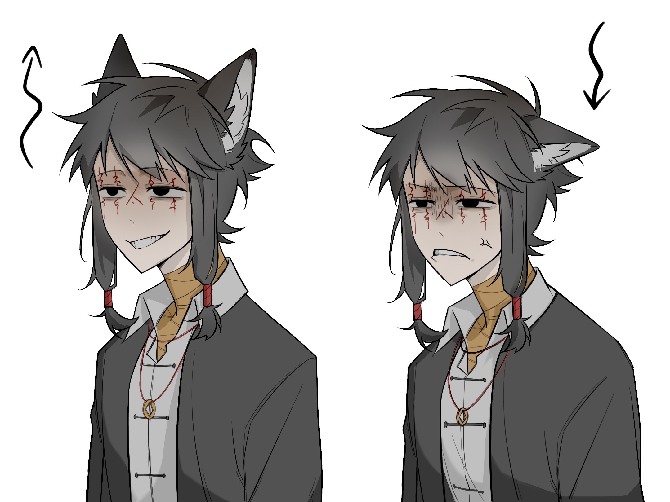 1boy abalabalizhi57400 anger_vein animal_ear_fluff animal_ears bandaged_neck bandages black_eyes black_hair black_jacket cat_boy cat_ears cat_tail chinese_commentary clenched_teeth coin coin_on_string collared_shirt commentary_request facial_tattoo grin highres holed_coin jacket jewelry kemonomimi_mode low-tied_sidelocks male_focus mole mole_under_eye multiple_views necklace open_clothes open_collar open_jacket shirt short_hair_with_long_locks sidelocks simple_background smile tail tattoo teeth touqi_guaitan upper_body white_background white_shirt ziche_fuzhao