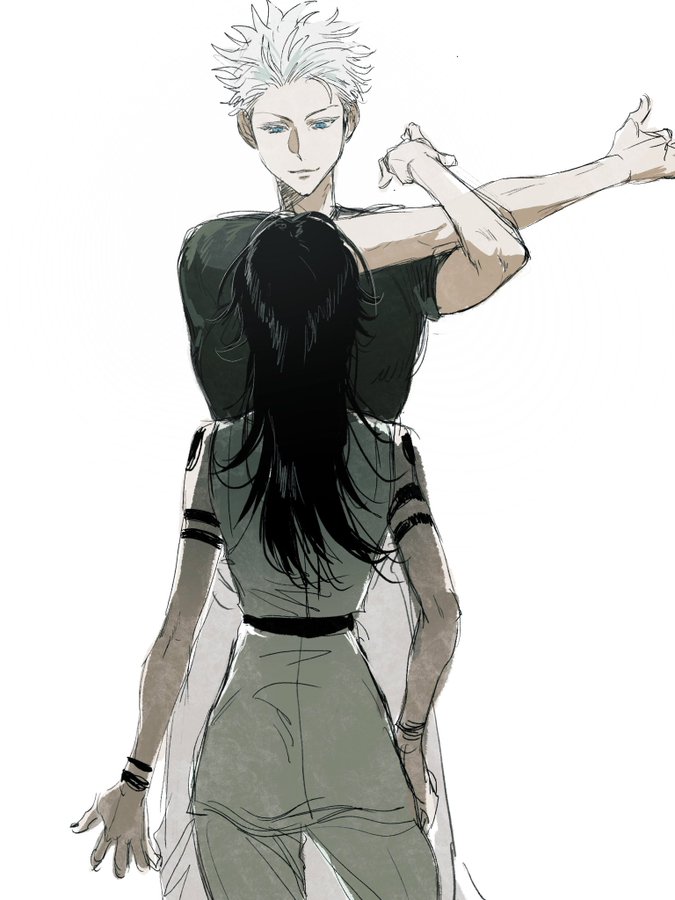 1girl arm_tattoo black_hair blue_eyes fallsoki fushiguro_megumi genderswap genderswap_(mtf) gojo_satoru jujutsu_kaisen looking_down looking_up ryoumen_sukuna_(jujutsu_kaisen) shirt extendable_limbs stretching tattoo white_background white_hair white_shirt