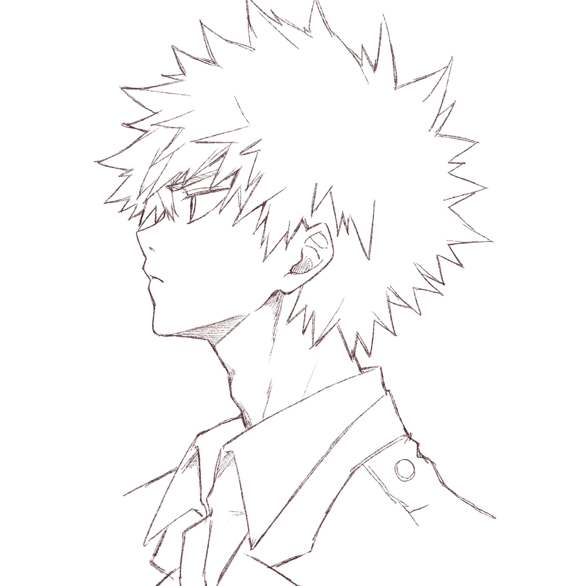 1boy adam's_apple bakugou_katsuki boku_no_hero_academia closed_mouth collared_shirt dwun_pubg hair_between_eyes highres layered_clothes light_frown lineart looking_ahead male_focus monochrome portrait profile shirt simple_background solo spiked_hair white_background wing_collar