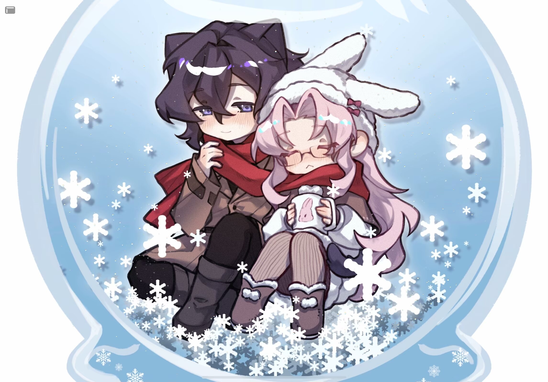 2boys :< alternate_costume animal_ears black_boots black_hair black_pants blush boots bow brown_boots brown_jacket brown_pantyhose cat_boy cat_ears cat_tail chinese_commentary closed_eyes closed_mouth colored_eyelashes commentary_request crossed_bangs cup deformed fake_animal_ears film_grain fur-trimmed_boots fur-trimmed_footwear fur_trim hair_between_eyes hat hat_bow hatsutori_hajime highres holding holding_cup jacket kemonomimi_mode long_hair long_sleeves male_focus mug multiple_boys pants pantyhose parted_bangs pink_hair purple_eyes rabbit_ears red_bow red_scarf saibou_shinkyoku scarf shared_clothes shared_scarf short_hair shorts sidelocks simian_qiao_gu sitting smile snow_globe snowflakes striped_clothes striped_pantyhose tail tail_wrap utsugi_noriyuki vertical-striped_clothes vertical-striped_pantyhose white_shorts