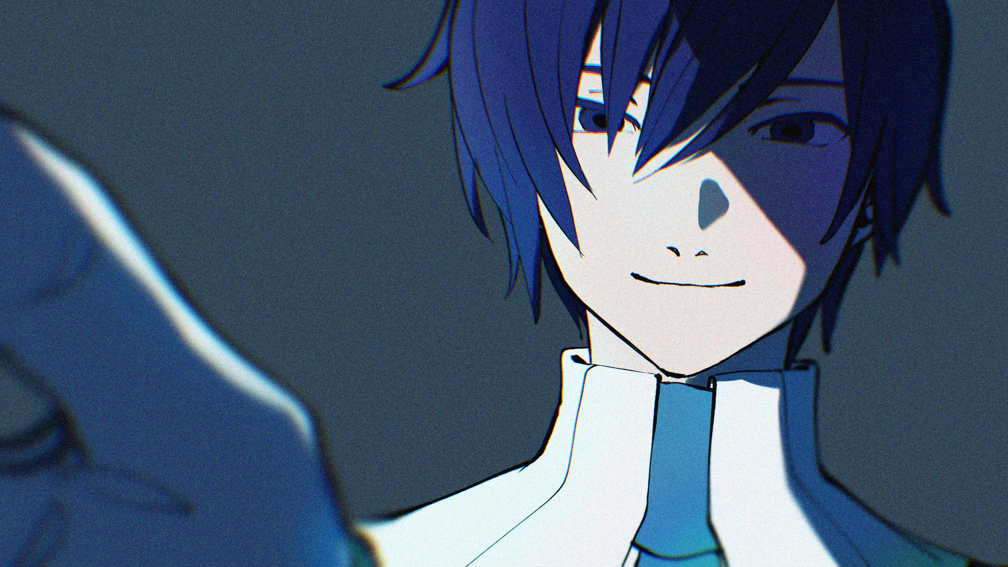 1boy arm_up blue_background blue_eyes blue_hair blue_shirt closed_mouth collared_jacket commentary film_grain hair_between_eyes hashtag-only_commentary highres jacket kaito_(vocaloid) madoi_io male_focus outstretched_arm partially_shaded_face shirt simple_background smile solo undershirt vocaloid white_jacket