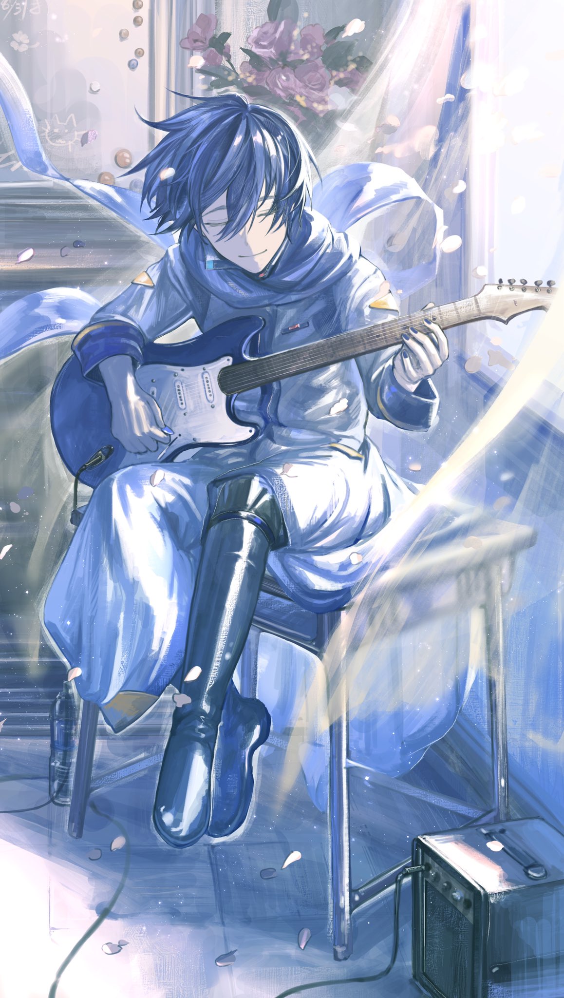 1boy amplifier black_boots blue_hair blue_scarf blue_trim boots closed_eyes closed_mouth coat commentary crossed_ankles curtains desk electric_guitar falling_petals floating_clothes flower guitar hair_between_eyes highres ill_0619 indoors instrument kaito_(vocaloid) kaito_(vocaloid3) leaf long_scarf long_sleeves male_focus music petals pink_flower playing_guitar playing_instrument scarf school_desk see-through_curtains short_hair sitting sleeve_cuffs smile solo thigh_boots vocaloid white_coat window wire