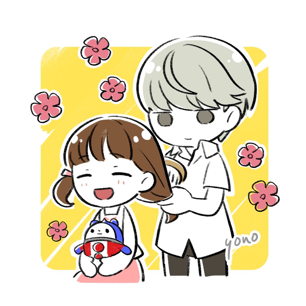 1boy 1girl :d ^_^ artist_name blunt_bangs blush border brother_and_sister brown_hair brushing_hair character_doll chibi chibi_only child closed_eyes closed_mouth collared_shirt commentary cowboy_shot doll doujima_nanako dress flower grey_eyes grey_hair hair_brush hairdressing happy holding holding_another's_hair holding_hair_brush narukami_yu open_mouth persona persona_4 pink_dress pink_flower shirt short_hair short_sleeves siblings simple_background sleeveless sleeveless_dress smile twintails upper_body white_border white_shirt yellow_background yono_999