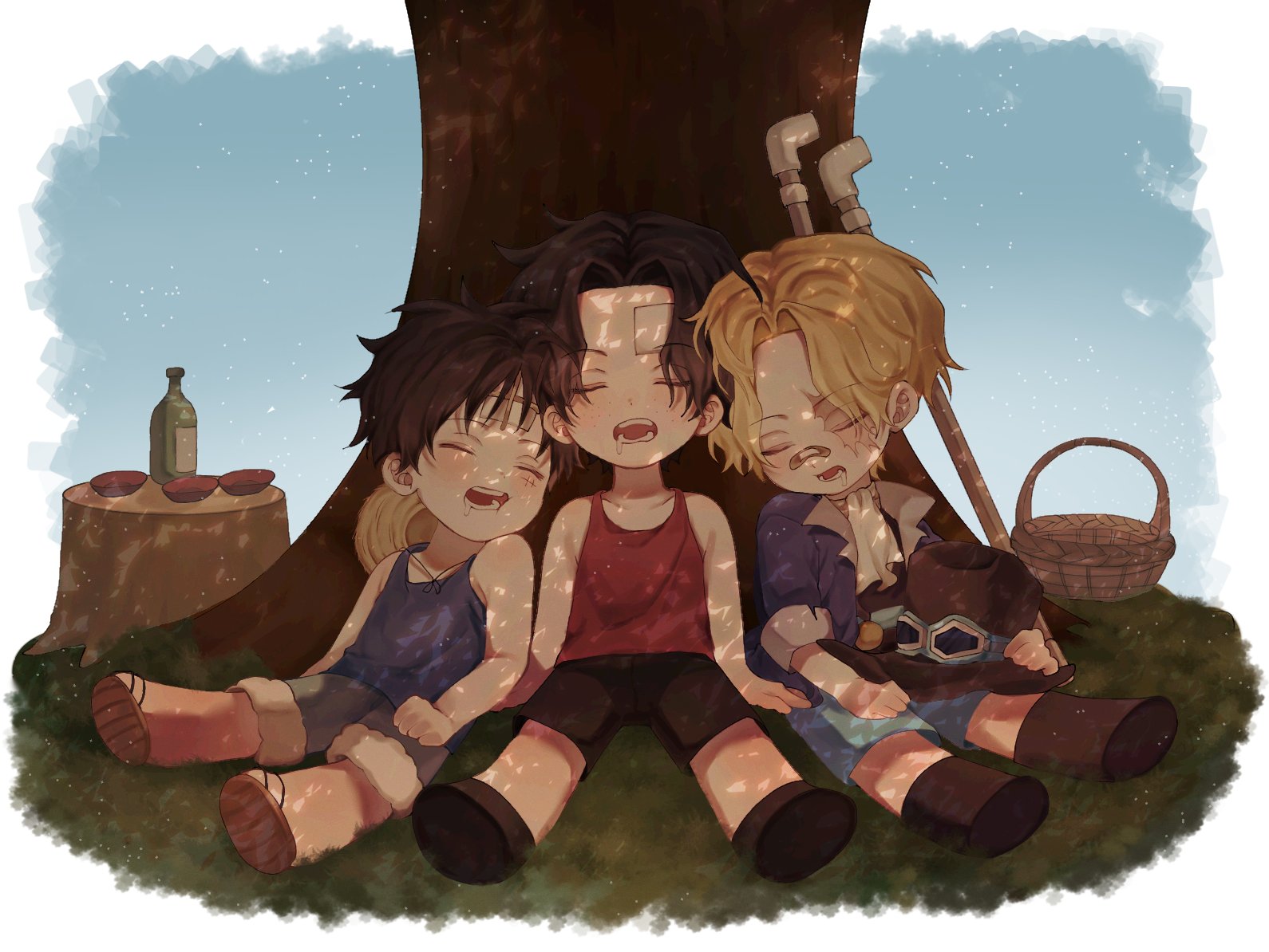 3boys aged_down ascot bandaid bandaid_on_face black_hair blonde_hair blue_coat blue_shorts blue_tank_top bottle brothers child coat commentary_request full_body goggles goggles_on_headwear korean_commentary male_focus monkey_d._luffy multiple_boys n_o1n2 one_piece open_mouth portgas_d._ace red_tank_top sabo_(one_piece) sandals scar scar_on_face short_hair shorts siblings sleeping tank_top tree white_ascot